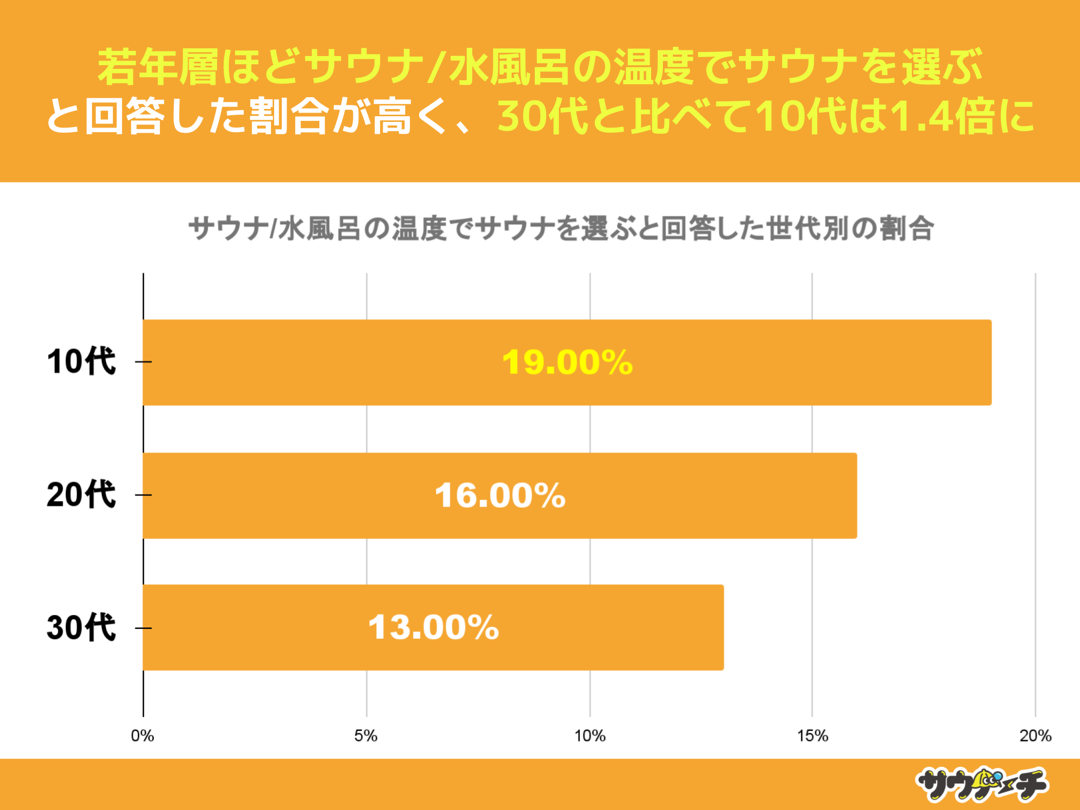 サウナ/水風呂の温度でサウナを選ぶと回答した割合を世代別でみてみますと、10代の19%が最も高く、次いで20代の16%、30代が13%で、30代と比べて10代は1.4倍高い結果となりました。
