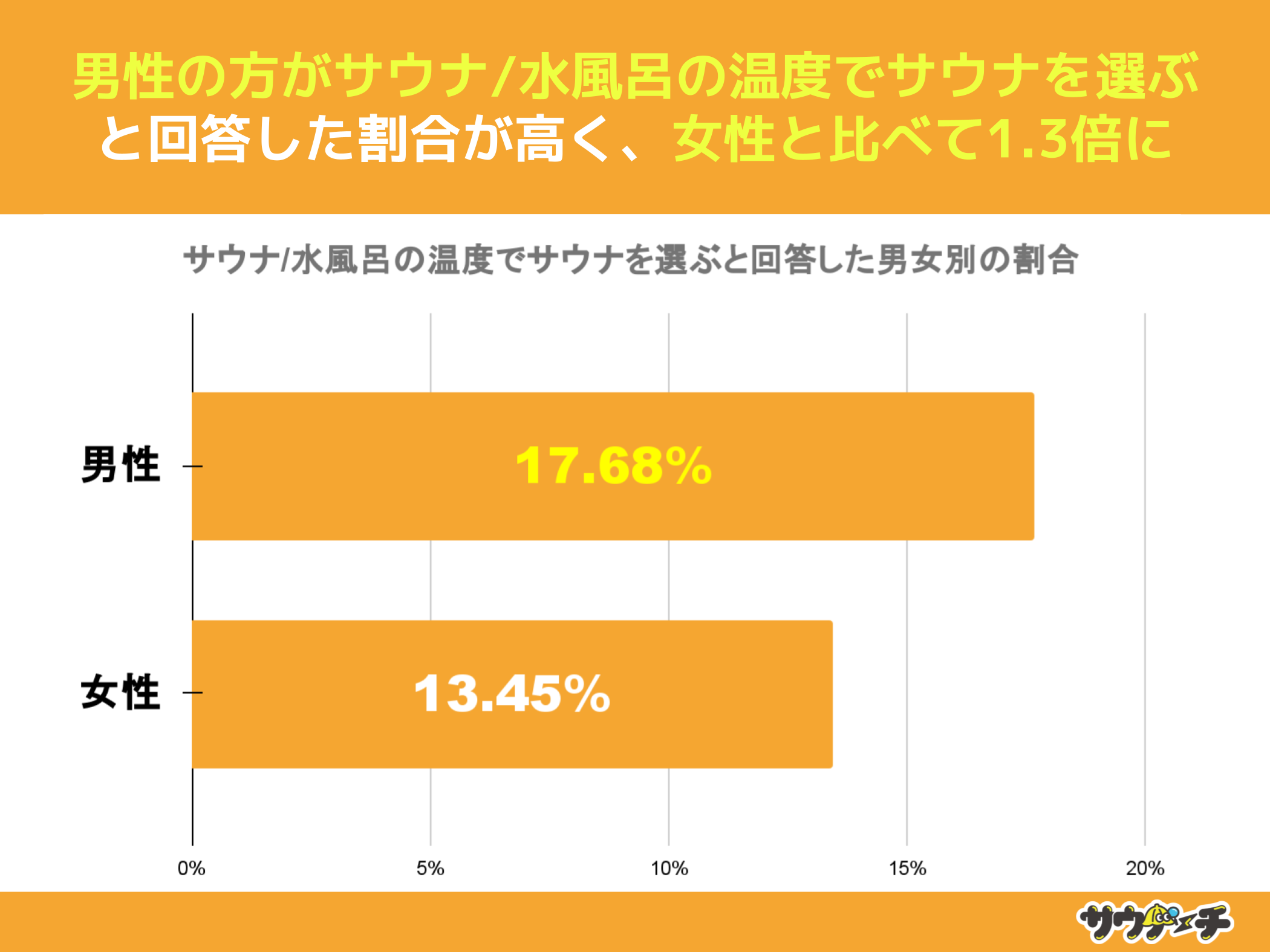 サウナ/水風呂の温度でサウナを選ぶと回答した割合を男女別でみてみますと、男性が17.68%、女性が13.45%で、女性と比べて男性は1.3倍高い結果となりました。