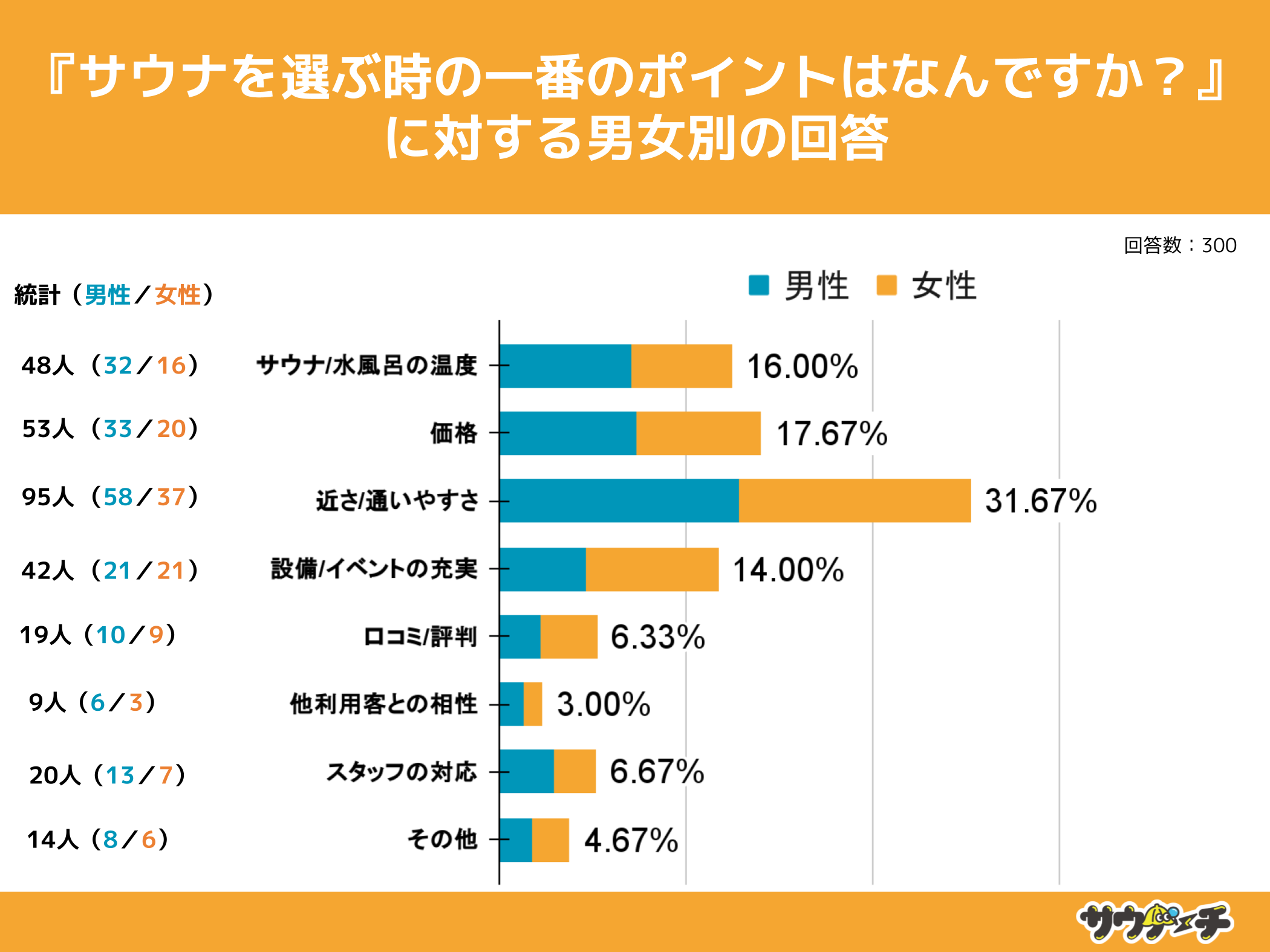 10代〜30代男女を対象とした「サウナを選ぶ時の一番のポイントはなんですか?」というアンケートで、最も多かった回答は「近さ/通いやすさ」で31.67%でした。