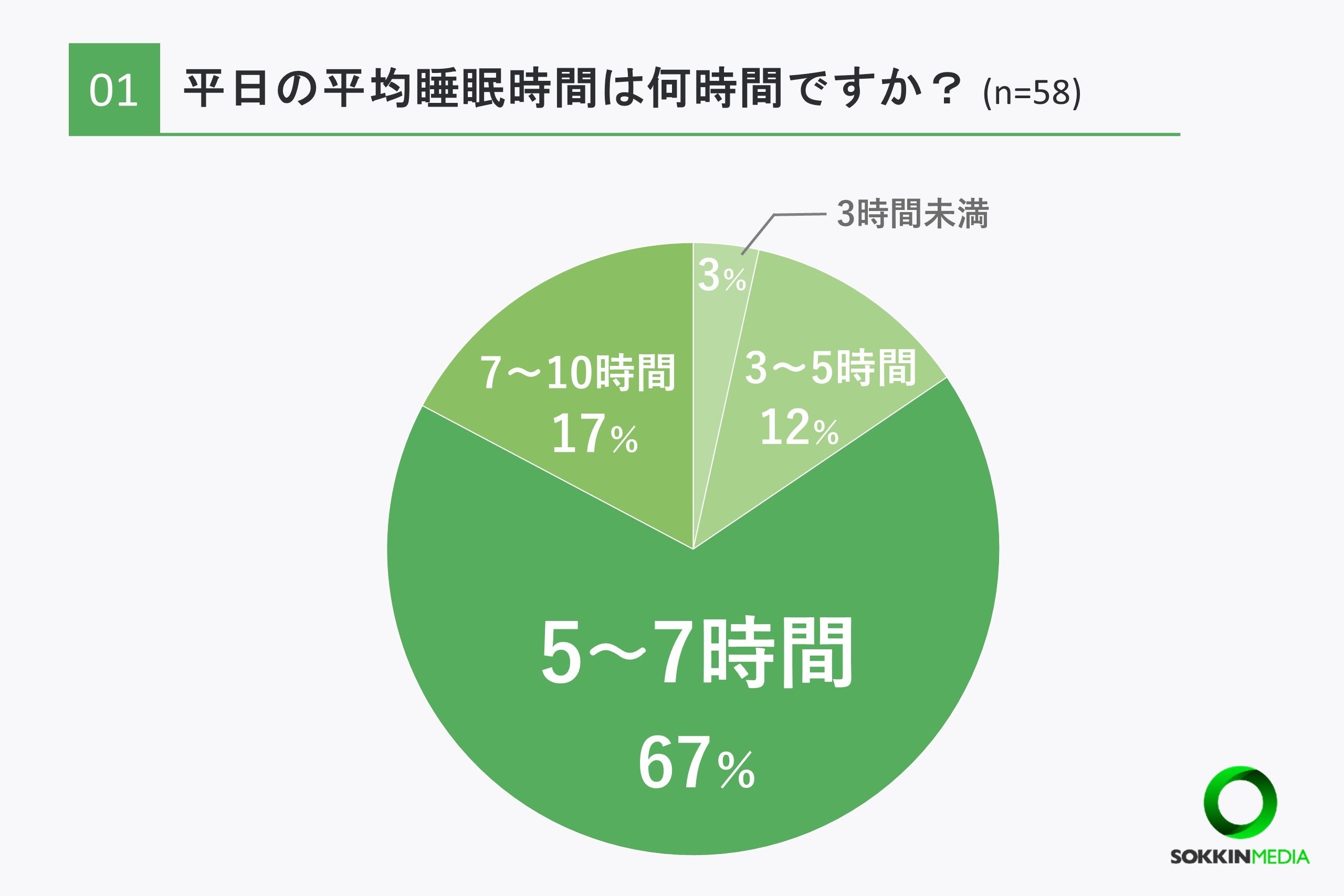 「Q1.平日の平均睡眠時間は何時間ですか?」という問いに対して、「5~7時間」と答えた方が最も多く67%に上り、次いで「7~10時間」という回答が17%という結果になりました。