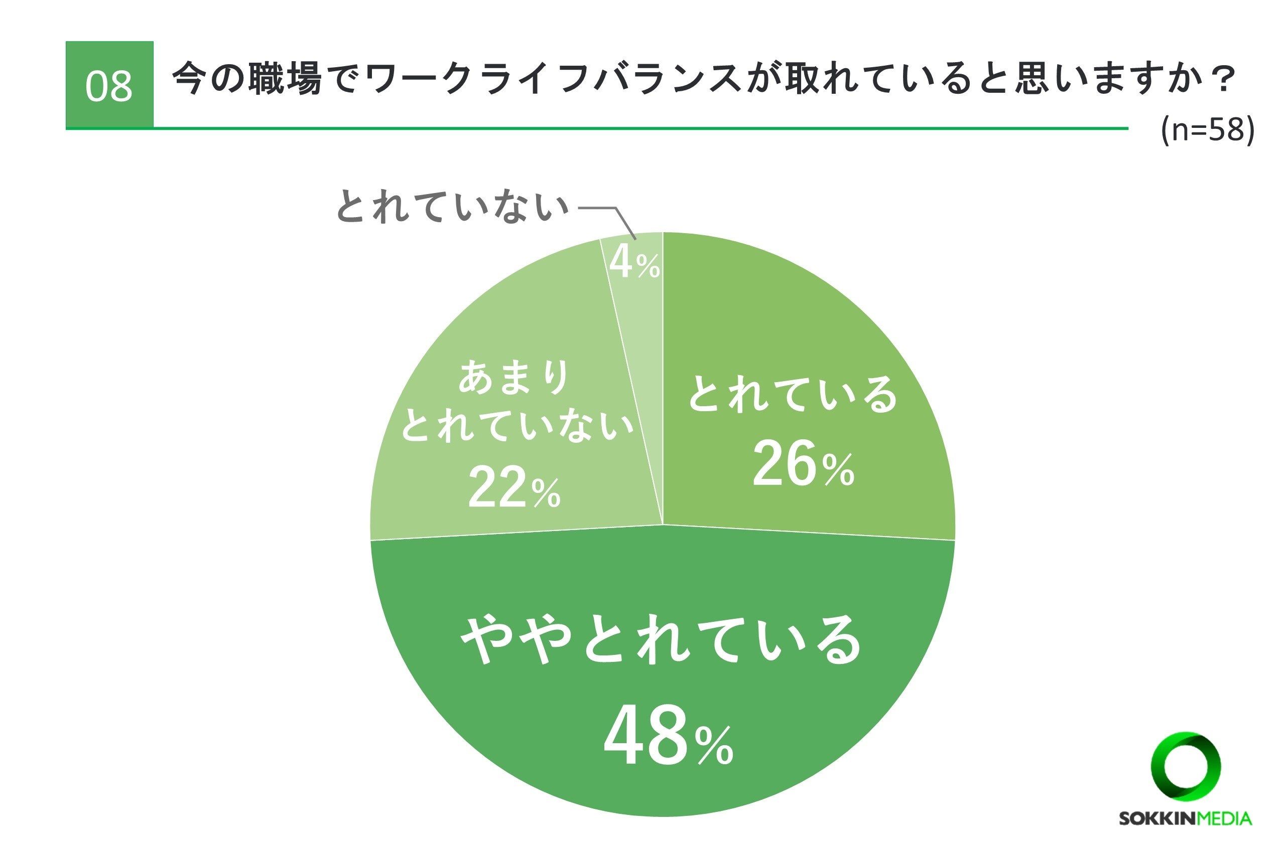 「Q8.今の職場でワークライフバランスが取れていると思いますか?」という問いに対して、「ややとれている」と回答した方が最も多く48%。次いで「とれている」という回答が26%という結果になりました。