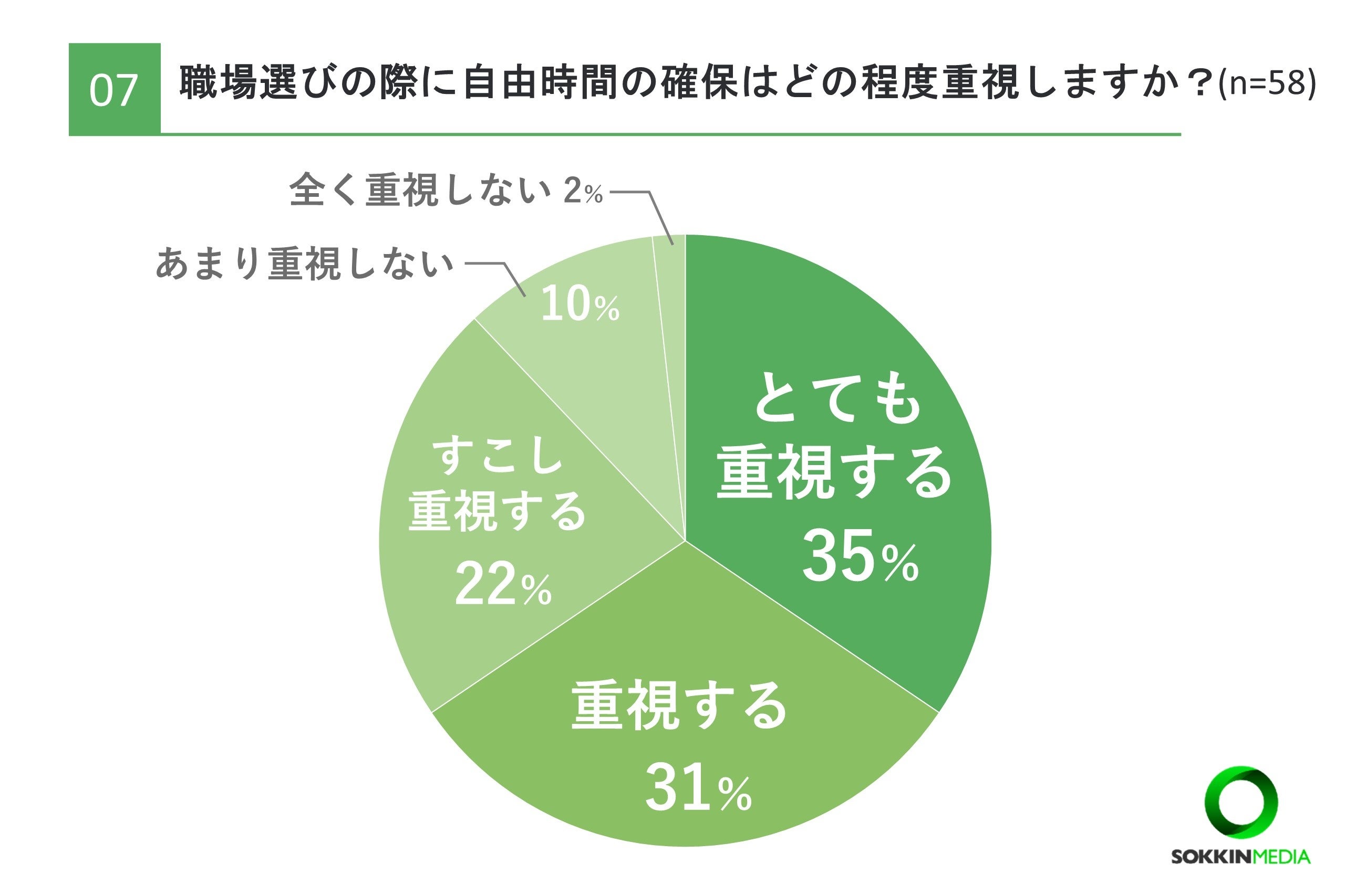 「Q7.職場選びの際に自由時間の確保はどの程度重視しますか?」という問いに対して、「とても重視する」と回答した方が最も多く35%という結果になりました。次いで「重視する」という回答が31%でした。