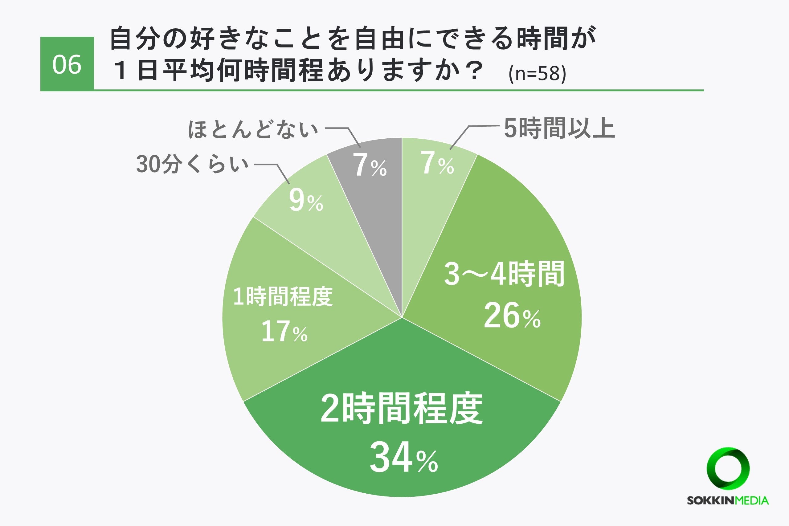 「Q6.自分の好きなことを自由にできる時間が1日平均何時間程ありますか?」という問いに対して、「2時間程度」と回答した方が最も多く34%という結果になりました。次いで「3~4時間」という回答が26%でした。