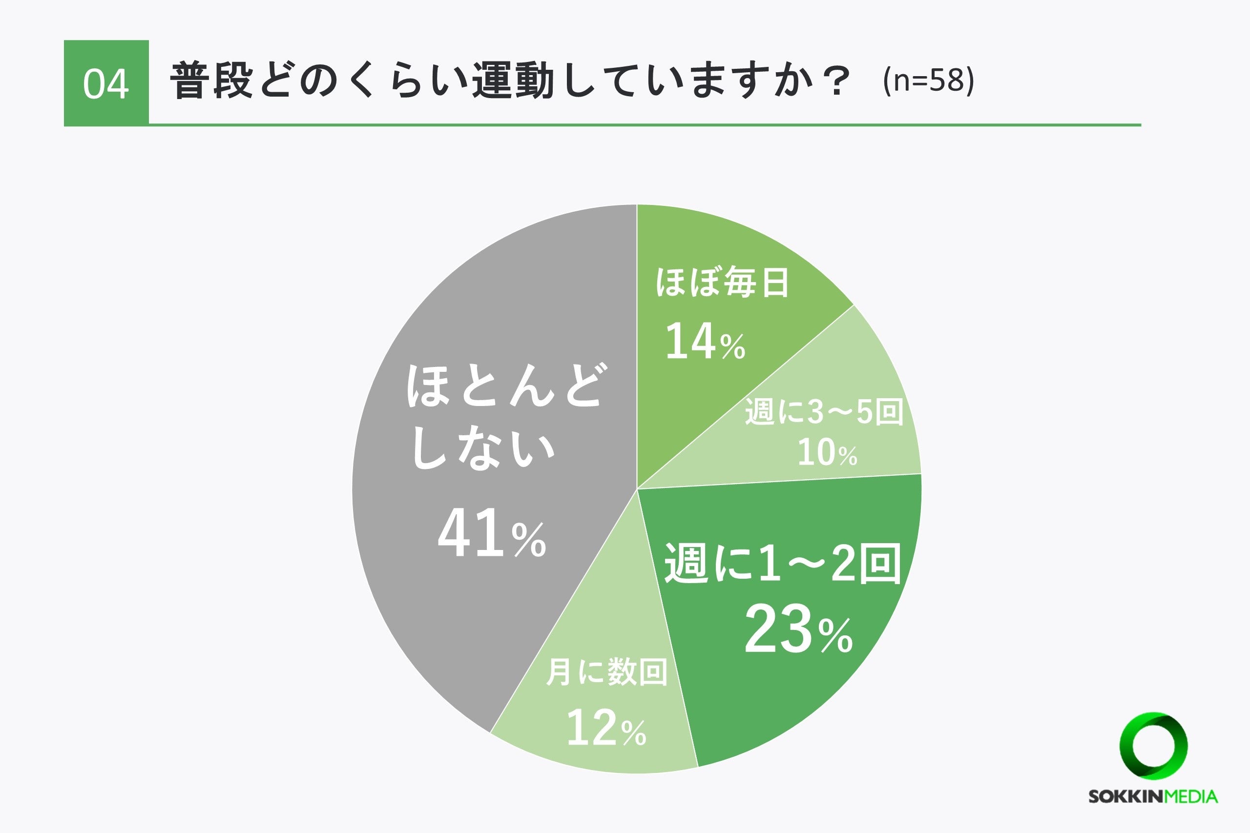 「Q4.普段どのくらい運動していますか?」という問いに対して、「ほとんどしない」という回答が最も多く41%に上りました。次いで「週に1~2回」という回答が23%となっています。