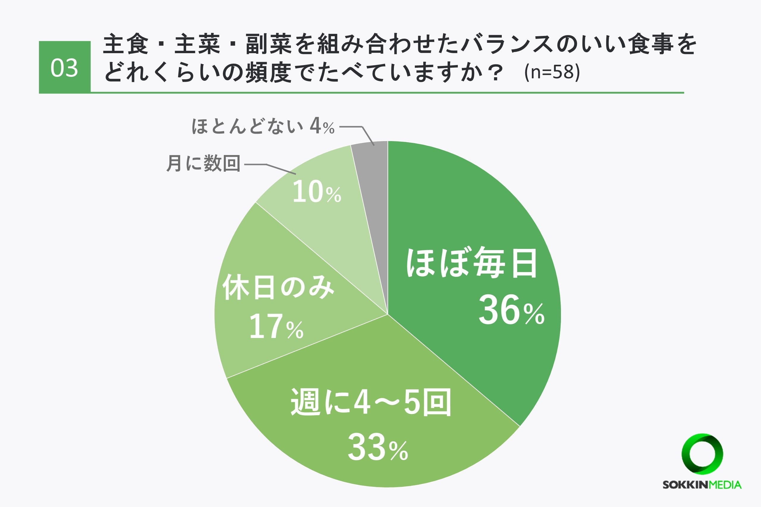「Q3.主食・主菜・副菜を組み合わせたバランスのいい食事をどれくらいの頻度でたべていますか?」という問いに対して、「ほぼ毎日」と答えた方が最も多く36%となりました。次いで「週に4~5回」という回答が33%となっています。