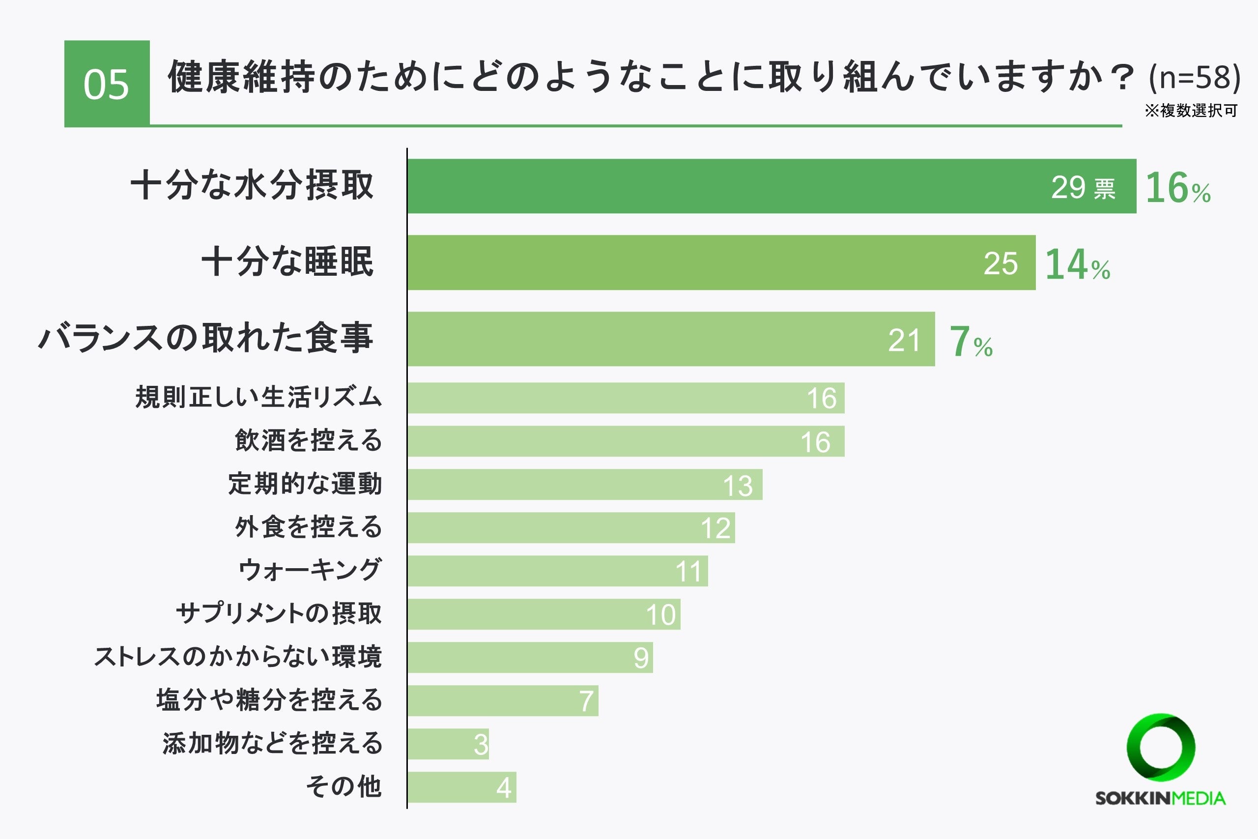 「Q5.健康維持のためにどのようなことに取り組んでいますか?」という問いに対して、「十分な水分摂取」という回答が最も多く29票、次いで「十分な睡眠」という回答が25票という結果になりました。