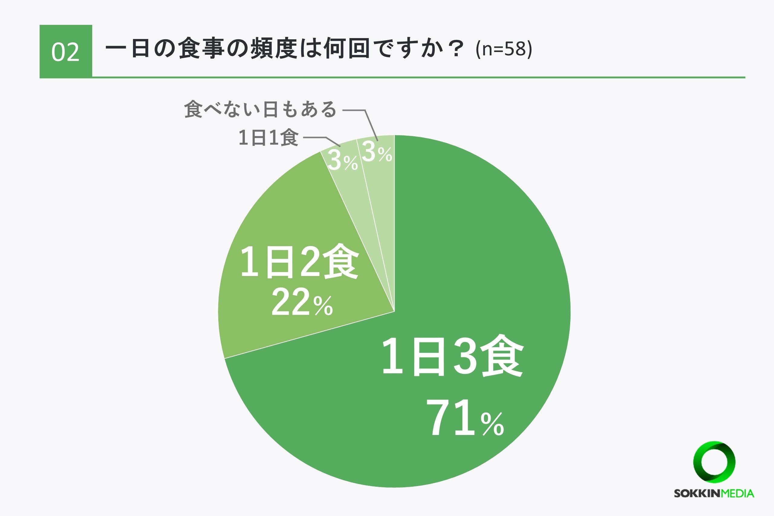 「Q2.一日の食事の頻度は何回ですか?」という問いに対して、「1日3食」が最も多く挙げられ71%となりました。次いで、「1日2食」という回答が22%となっています。