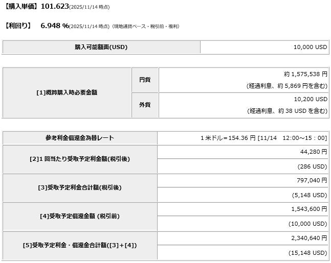 米ドルまたは日本円で、債券購入に必要となる購入金額や受取予定金額をご確認いただけます。