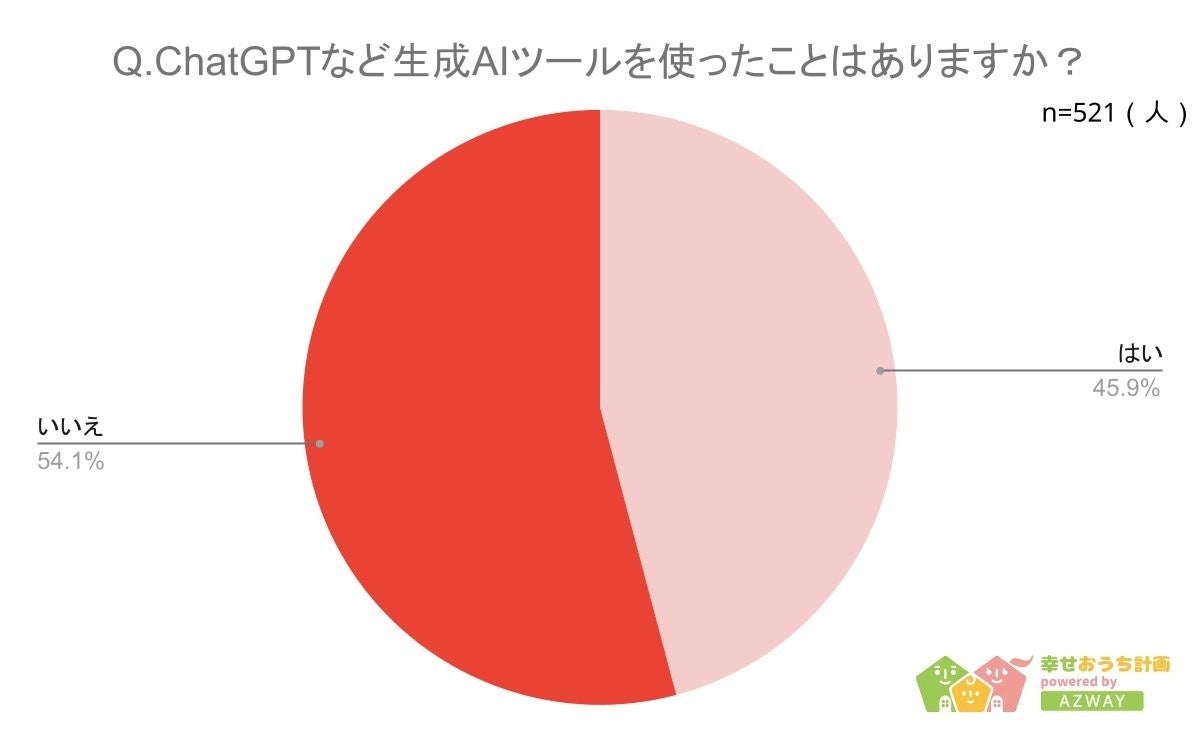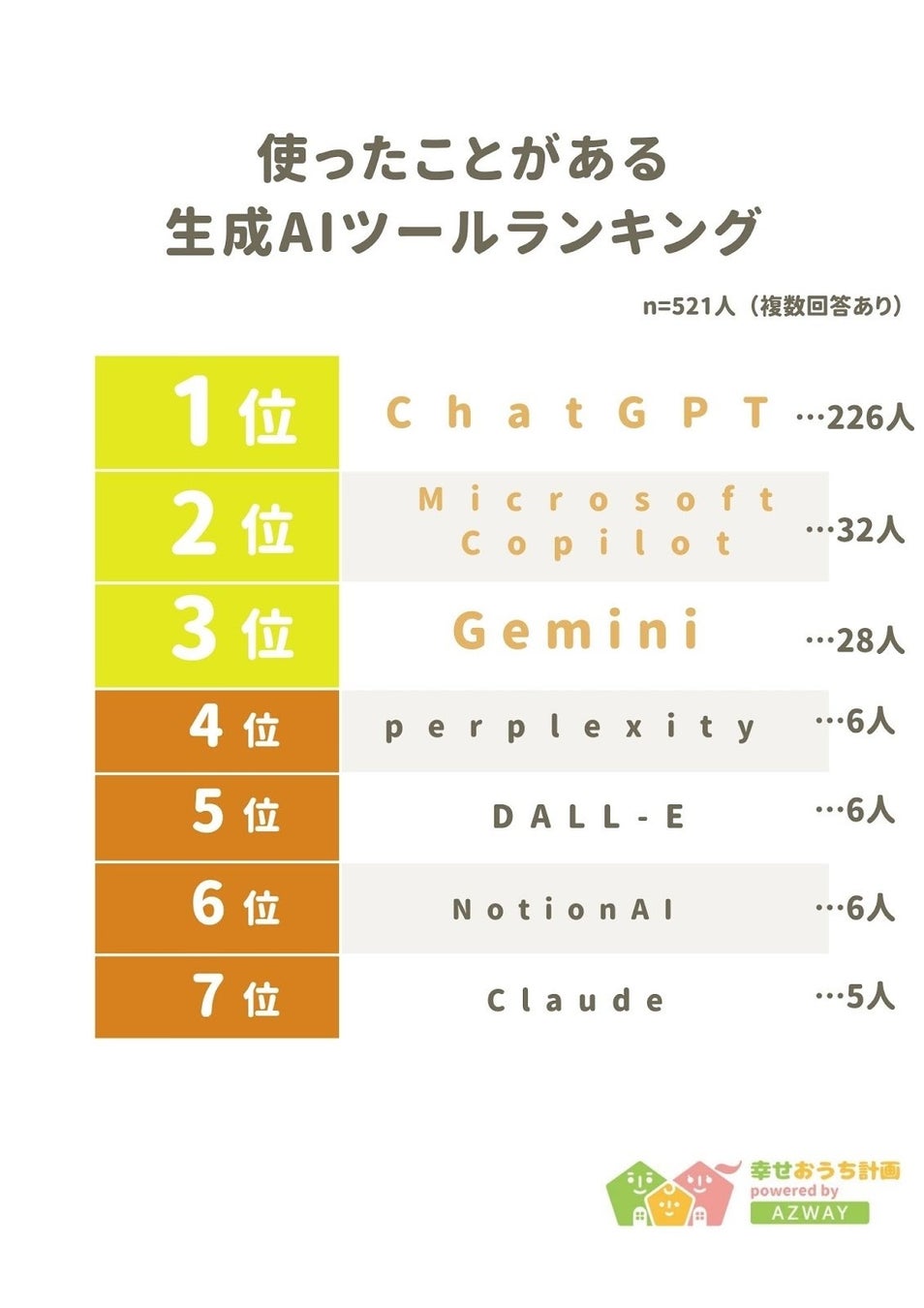 今回、株式会社AZWAY(https://azway.co.jp/)が運営する、幸せおうち計画(https://azway.co.jp/media/)は、10代から60代以上までの521人を対象に「使ったことがある生成AI」についてアンケート調査を実施しました。