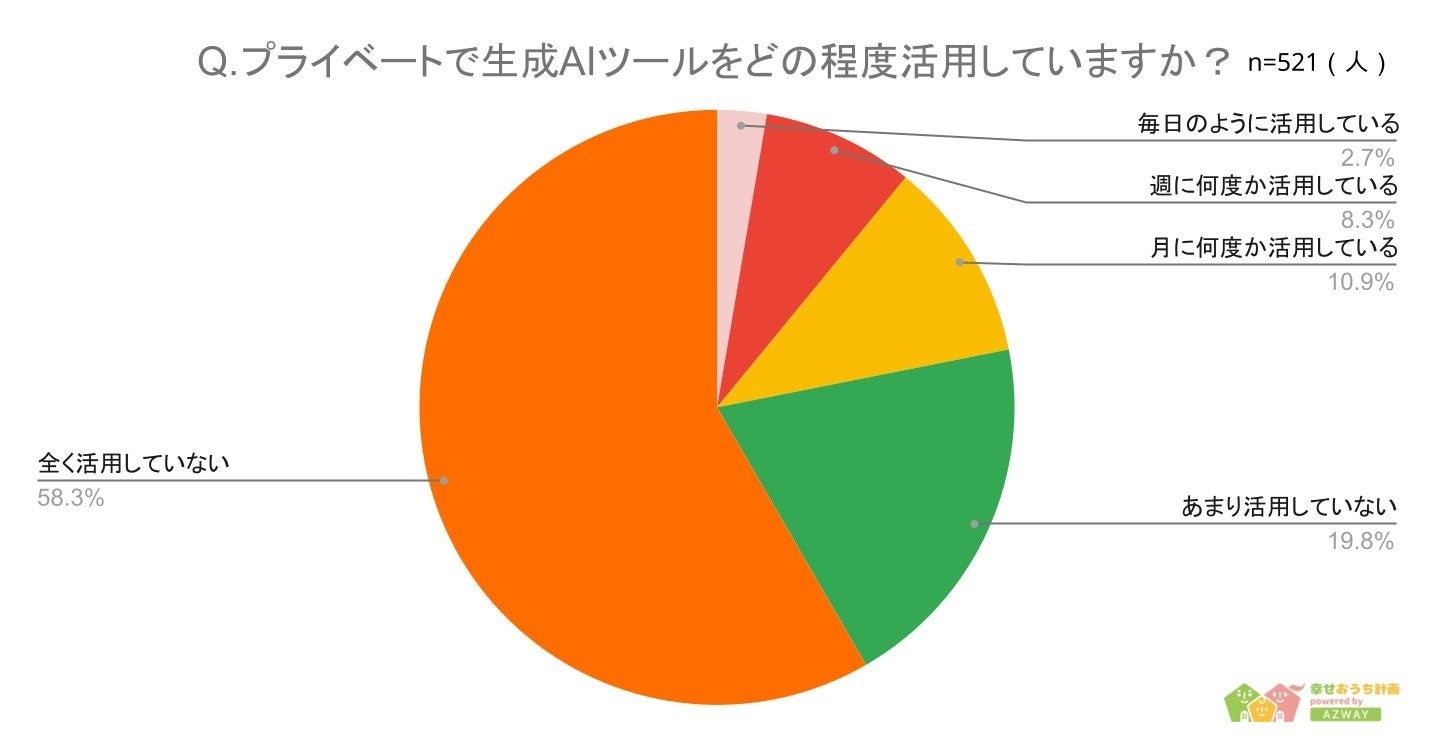 また、「プライベートで生成AIツールを活用している頻度」について聞いたところ、「全く活用していない」が1位で58.3%、「あまり活用していない」が2位で19.8%、「月に何度か活用している」が3位で8.3%という結果になりました。「月に何度か活用している」「週に何度か活用している」「毎日のように活用している」を選んだ人の合計の割合は、仕事のときより若干少ない傾向にあり、生成AIツールは仕事で使われることの方が多いことがわかります。