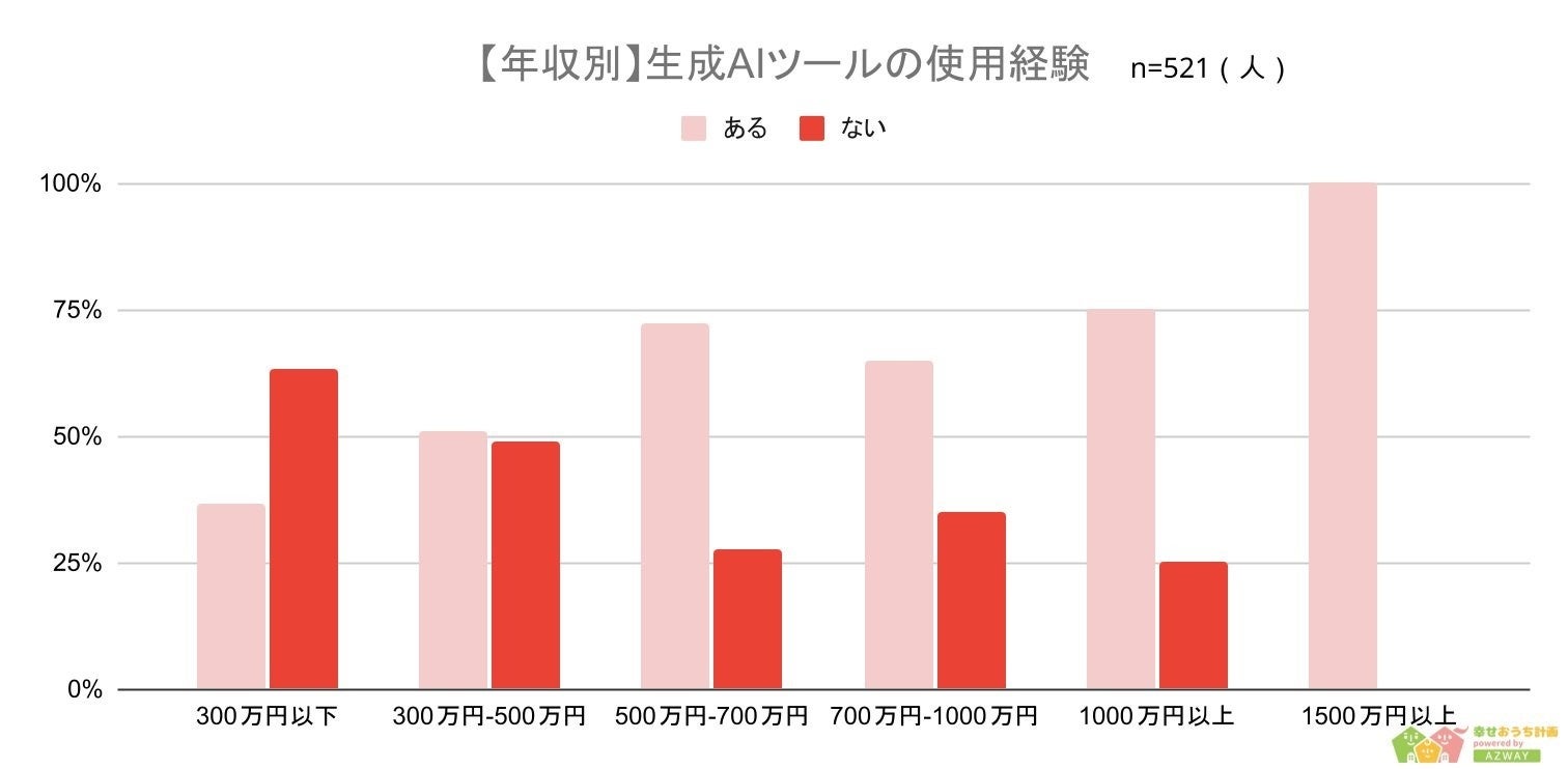 また、年収別に「生成AIの使用経験」を分析したところ、300万円以下の人では「使用経験がない」人が63.2%だったのに対し、1,000万円以上の人では「使用経験がない」人は25%と年収300万円以下の人の半分以下という結果に。年収が高い人ほど、生成AIツールを使用した経験があり、新しいものに関心があることがわかりました。