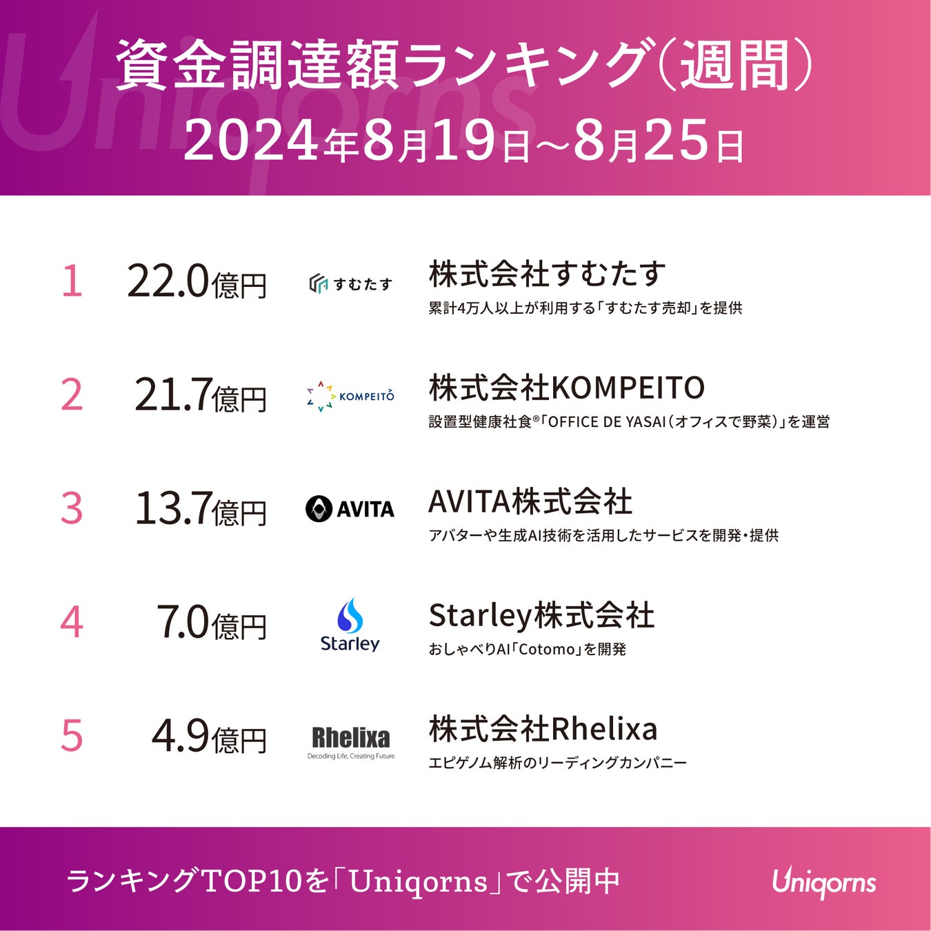 国内最大級のスタートアップメディア「Uniqorns(ユニコーンズ)」が2024年8月19日〜8月25日のスタートアップ資金調達状況をランキング形式で発表