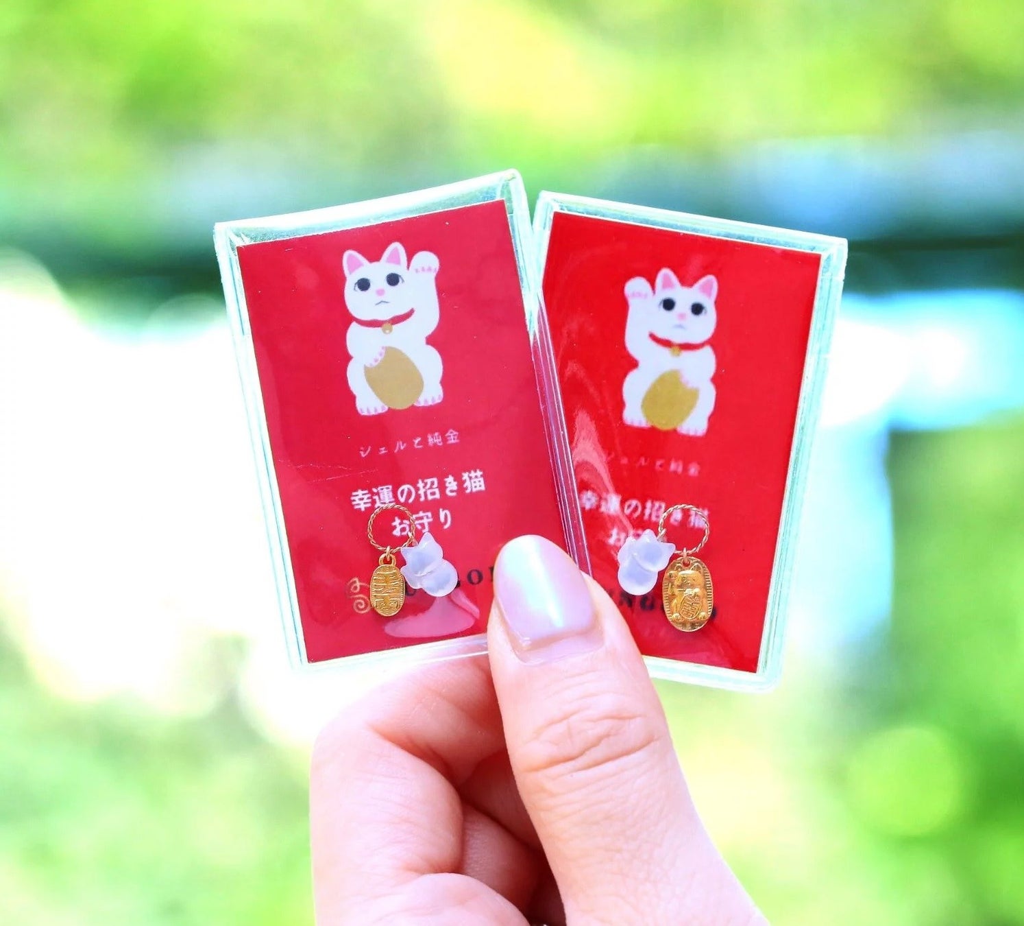 昔からの縁起物「招き猫」と純度99.9%の本物の「純金で作った小判」をセットにすることで、より縁起良く仕上げたお守りです。