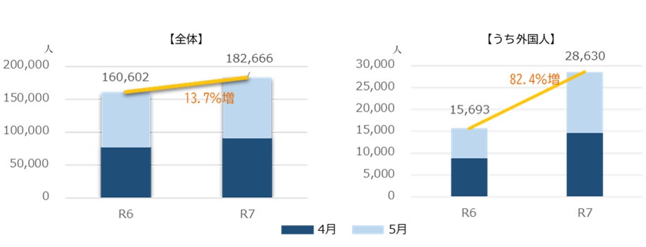 和歌山市における令和7年4月・5月の宿泊客数は、合計182,666人で、前年同月(4・5月計)より13.7%増加しました。