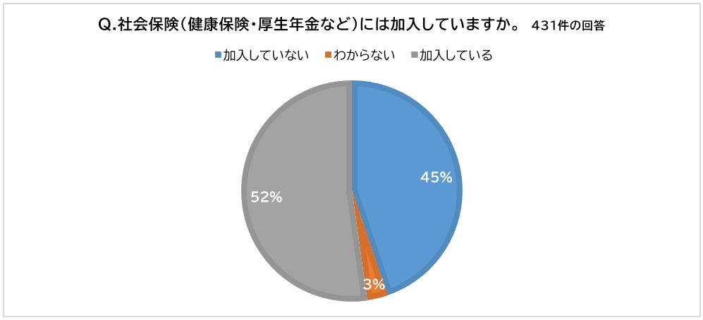 約5割が社会保険に未加入という結果に。加入を拒まれるケースも多く、「病院に行けない」「将来が不安」という切実な声が寄せられました。医療・年金・労災などの社会保障から取りこぼされている層が一定数存在し、セーフティネットの欠如が生活不安に拍車をかけています。