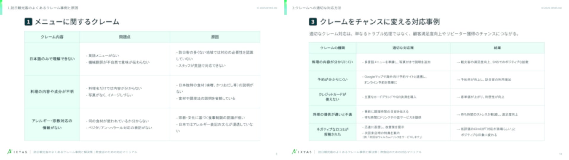 本資料では、訪日観光客が飲食店で不満を感じやすいポイントを具体的なクレーム事例とともに解説し、それぞれのクレームに対する適切な対応策を紹介します。また、クレームを未然に防ぐための予防策についても詳しく解説し、実践的な改善ポイントを提示します。