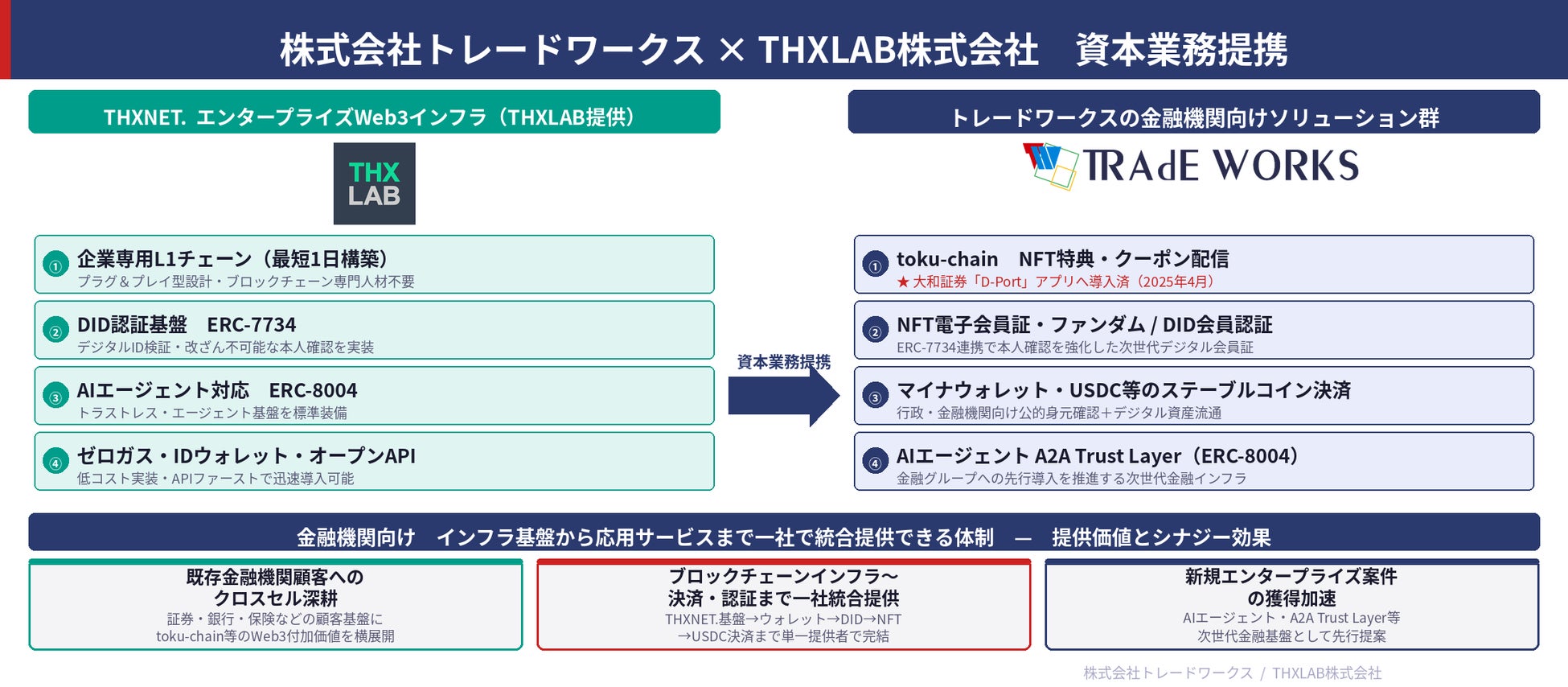 金融システム開発を中心にAI・セキュリティ・ブロックチェーンなどの先端技術を活用したソリューションを提供する株式会社トレードワークス(本社:東京都港区、代表取締役社長:齋藤 正勝、以下「当社」)は、Web3 as a Service(Web3aaS)プラットフォーム「THXNET.」を開発・運営するTHXLAB株式会社(本社:東京都港区、代表取締役CEO:近藤 浩太郎/Aro Kondo、以下「THXLAB」)と資本業務提携を締結いたしましたので、お知らせいたします。