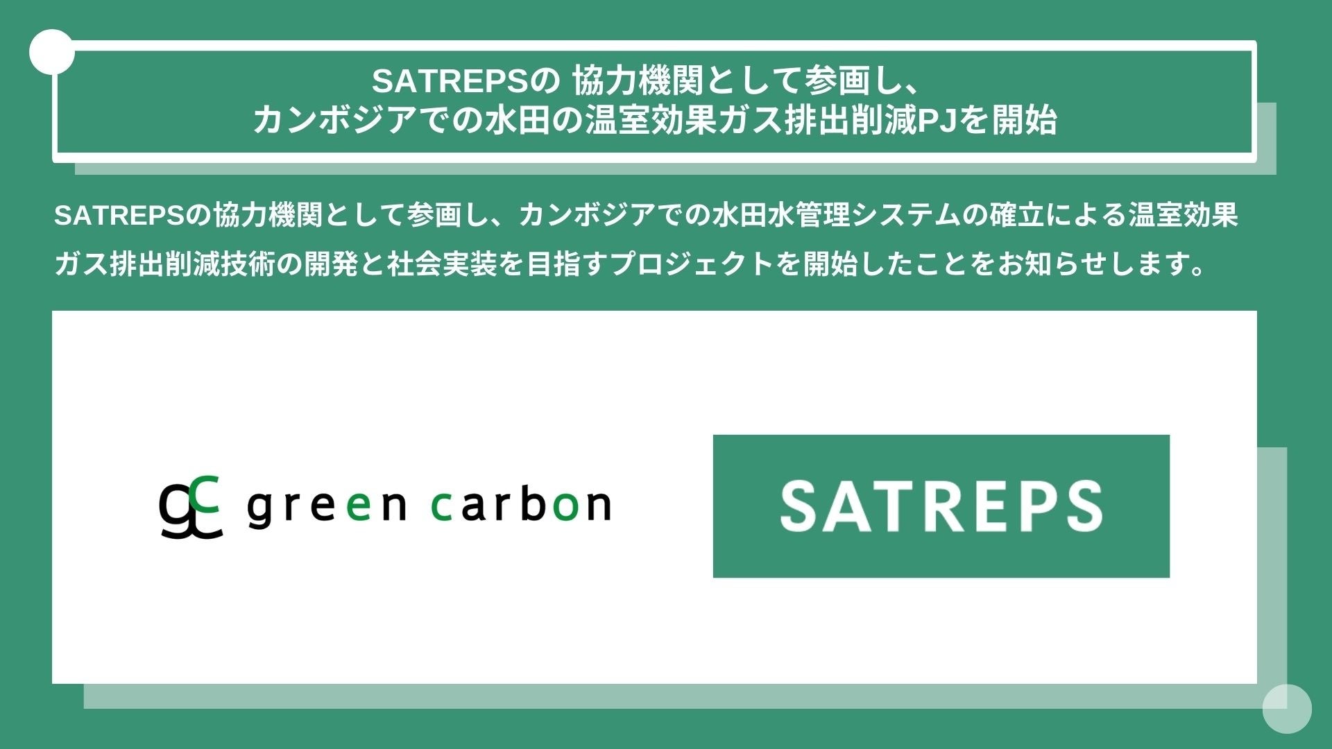 Green Carbon株式会社(代表取締役:大北潤、以下Green Carbon(読み;グリーンカーボン))はこの度、 JIRCAS(国際農林水産業研究センター、以下JIRCAS)が研究代表機関を務める*¹SATREPS( Science and Technology Research Partnership for Sustainable Development 、以下SATREPS)の協力機関として参画し、カンボジアでの水田水管理システムの確立による温室効果ガス排出削減技術の開発と社会実装を目指すプロジェクトを開始したことをお知らせします。