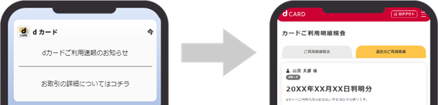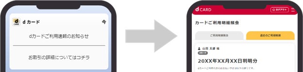「dカード」をご利用いただいた際に、ご利用の金額・日時などをメールやアプリなどで通知するサービスです(※4)。通知を受け取ることで、身に覚えのないご利用について把握ができ、より安心してご利用いただけます。通知の設定は、お客さまご自身でdカードサイトにて設定いただけます。