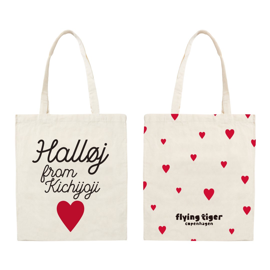 Flying Tiger Copenhagenでは、各店限定の『ストアリミテッドバッグ』を販売しています。〈吉祥寺ストア〉では、デンマークの人たちが大好きなモチーフ”ハート”と、メッセージ“Halløj from Kichijoji” (デンマーク語で「吉祥寺からこんにちは!」)を配したバッグを展開。4/26(金)のオープン日、先着100名様に、この『ストアリミテッドバッグ』をプレゼントします。