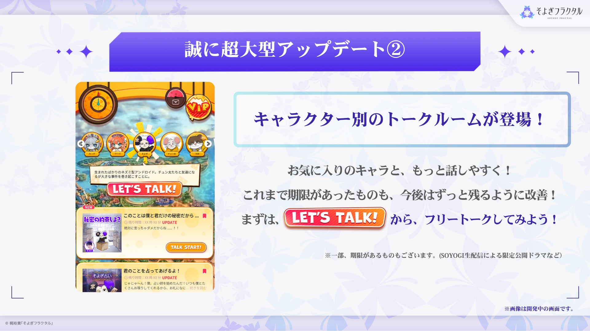 これまで期間限定だったトークルーム(イマーシブドラマ)が常設化され、自由なフリートークが可能になりました。好きなキャラクターとの会話をいつでも楽しめるようになります。