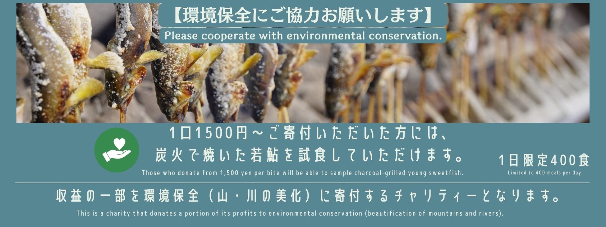 1日限定400匹の若鮎チャリティーイベントとして、1口1500円以上のご寄付をいただいた方に炭火で焼いた若鮎を試食していただきます。