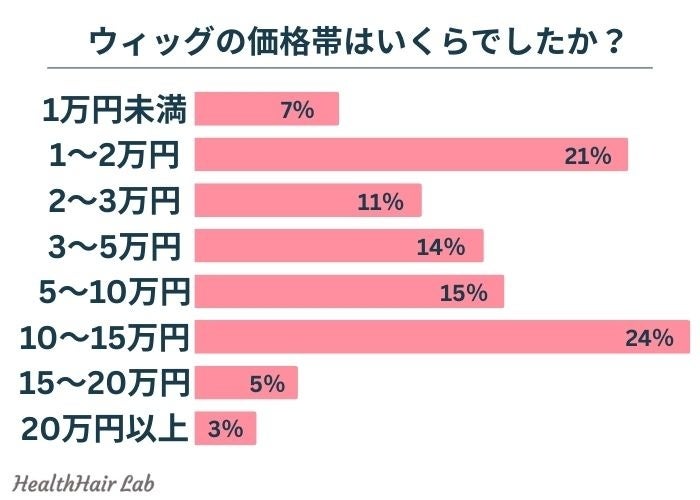 購入した医療用ウィッグの価格帯について伺ったところ、『1万円未満(7%)』『1〜2万円(21%)』『2〜3万円(11%)』『3〜5万円(14%)』『5〜10万円(15%)』『10〜15万円(24%)』『15〜20万円(5%)』『20万円以上(3%)』という回答が集まりました。