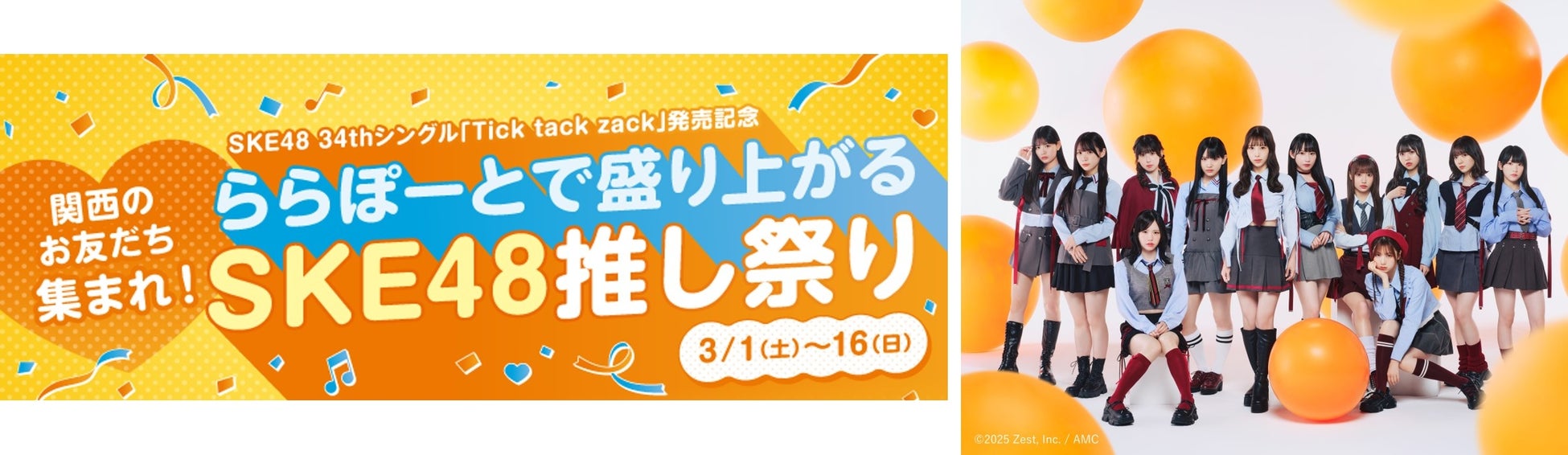 関西の三井ショッピングパーク ららぽーと甲子園、和泉、EXPOCITY、堺、三井ショッピングパーク ららぽーと門真・三井アウトレットパーク 大阪門真の5施設は、 2025年3月12日(水)に34枚目のシングル「Tick tack zack」をリリースする人気アイドルグループSKE48とのタイアップイベントを2025年3月1日(土)~3月16日(日)に開催いたします。