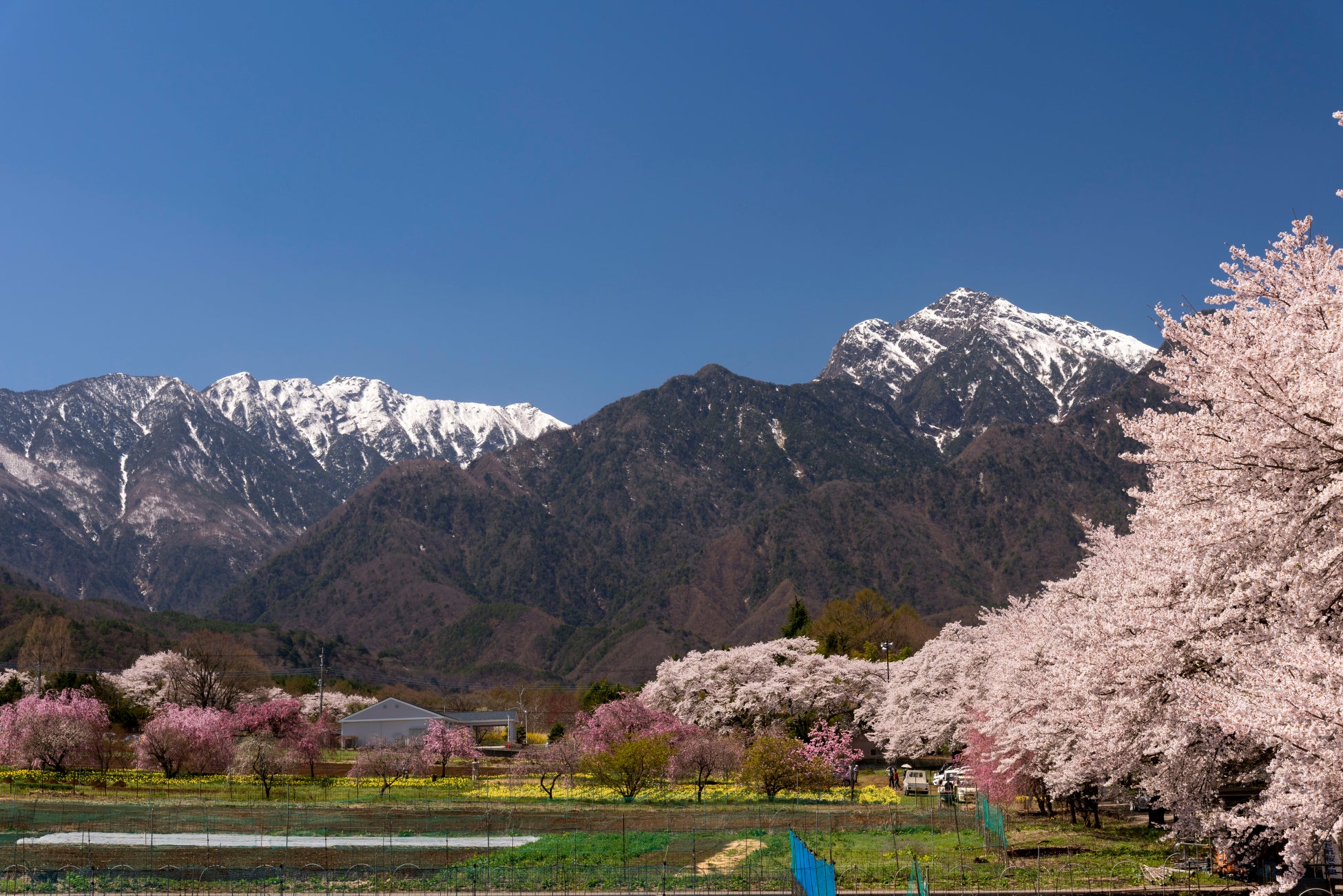 山梨県の北西部に位置する北杜市は、首都圏から車で2時間とアクセスが良く、南アルプス、八ヶ岳、奥秩父山塊など日本有数の山々に囲まれ、美しい山岳景観を誇っています。市内は居住区だけでも1,000mもの標高差があるため、桜は標高ごとに時期をずらしながら、3月下旬から4月下旬まであちこちで満開を迎え、2,000m級の山々に残る白い雪と、青い空、淡い桜の花びらのコントラストを楽しめるのが特徴です。