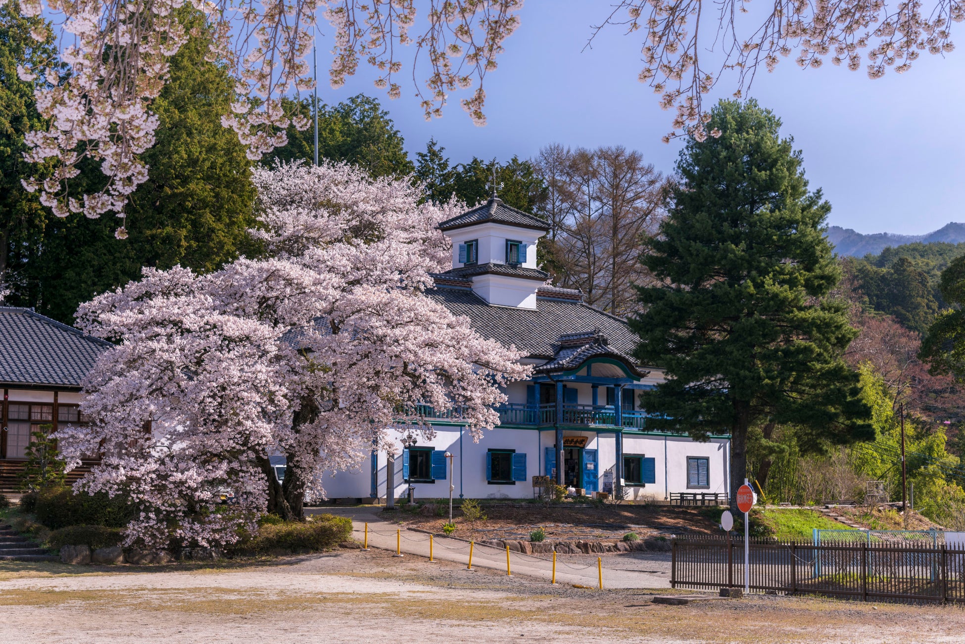 明治・大正・昭和の校舎が並ぶ校庭にソメイヨシノが約30本、里山の春に咲き誇ります。