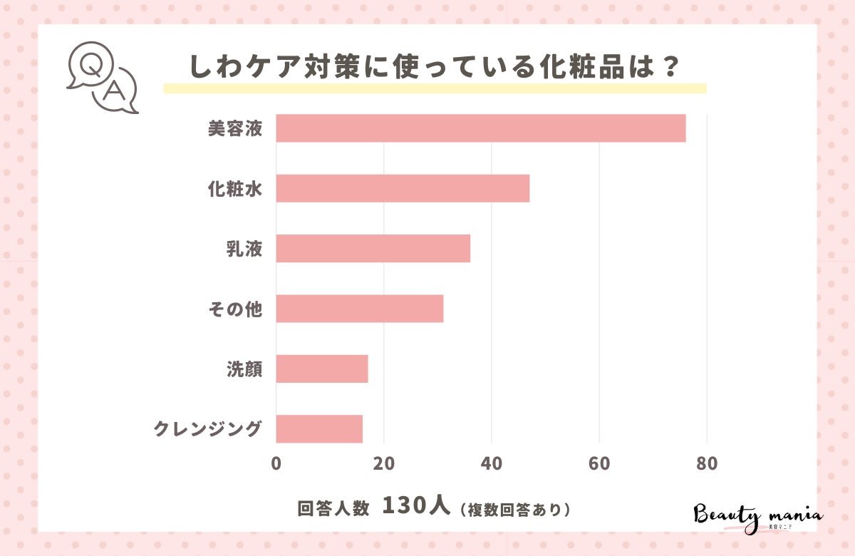 「シワケアの為に使っている化粧品はなんですか?」とアンケート調査した結果、1位は『美容液(76人)』、2位は『化粧水(47人)』、3位は『乳液(36人)』となっています。