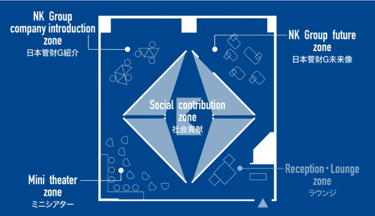 社章をモチーフにし、「ミニシアター」「日本管財グループ紹介」「社会貢献」「日本管財グループ未来像」の4つのゾーンに分け、企業理念や沿革、経営戦略などを紹介しています。*