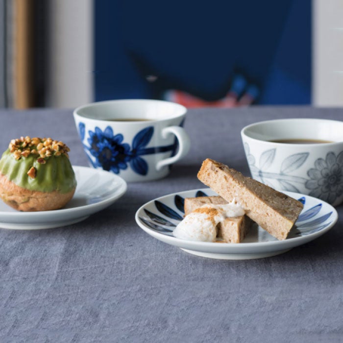 白い器に青やグレーの柄が人気のセット。大きめのマグカップは、スープカップとしても活躍します。ひとつひとつ手作業で描かれたデイジーの花柄が、食卓を華やかに彩ってくれますよ。