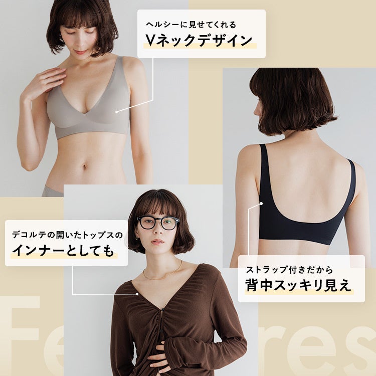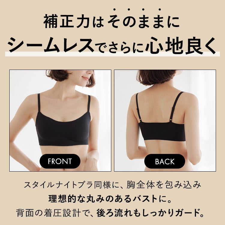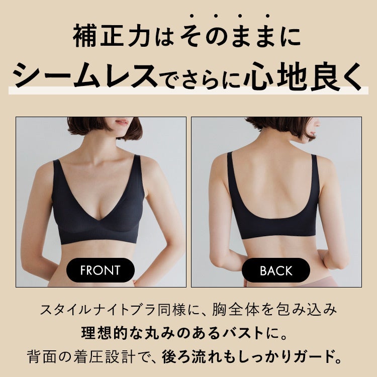 今回新たに、深めのVネックラインの「ナイトブラ シームレス Vネック」と、横に広いネックライン「ナイトブラ シームレス バンドゥ」の2種類を追加することで、より多彩なファッションやシーンに合わせて選んでいただけるようになりました。「ナイトブラ シームレス Vネック」は、胸元が開いた服でも合わせやすい深めのVネックでバストラインと谷間を美しく見せます。ノンワイヤーでリラックス感のあるつけ心地ながら、バストメイクパネルでしっかりしたフィット感を実現しました。女性らしいシルエットにするため肩紐は細くデザイン。また背面を大きく開け、背中をすっきりと見せます。 「ナイトブラ シームレス バンドゥ」は、横に広く開いた直線的なネックラインのバンドゥタイプ。胸元の開き具合を、広すぎず狭すぎず、ちょうどいいバランスになるよう調整しました。本体の構造でバストをしっかり支えるデザインと、バストメイクパネルにより高いホールド力を実現。さらに肩紐アジャスターで肩紐の長さが調整ができるのでフィット感も抜群です。