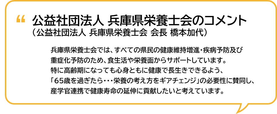 兵庫県における「65歳からは・・・栄養の考え方をギアチェンジ」の啓発は、年齢に応じた適切な栄養の知識を地域の人々の生活の場で普及啓発する、産学官連携の取り組みです。この啓発により、高齢者や家族が“メタボ対策の栄養の考え方”から“低栄養・フレイル対策の栄養の考え方”にギアチェンジすることを助け、兵庫県内の高齢者の低栄養・フレイル対策を推進します。