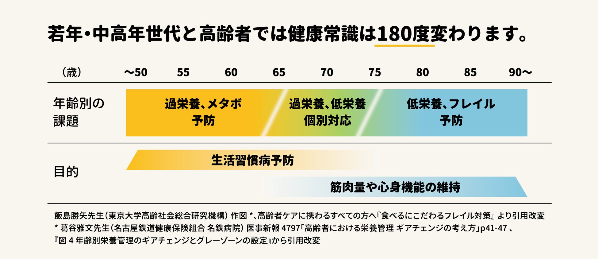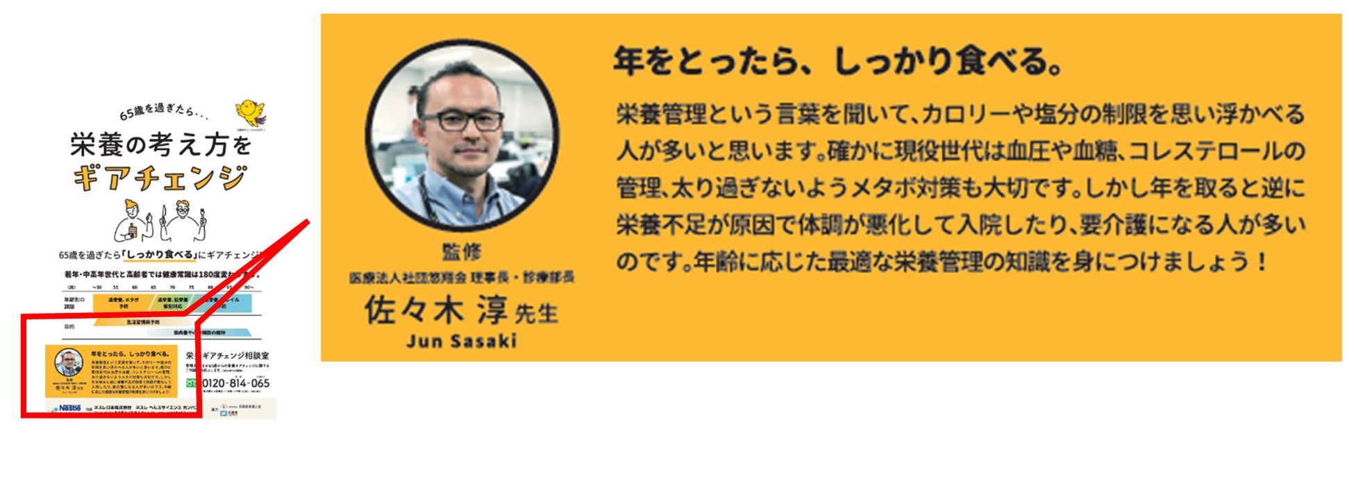 そこで、ネスレ ヘルスサイエンスは、佐々木淳先生の著書『在宅医療のエキスパートが教える 年をとったら食べなさい』(飛鳥新社、2021)に基づき、2024年春より佐々木淳先生監修の「65歳を過ぎたら・・・栄養の考え方をギアチェンジ」の啓発を開始しました。