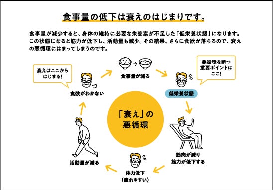 加齢による食欲の低下や、食べ物を噛んだり飲み込んだりする力が衰えることによって食事量が減少し、栄養不足につながります。栄養不足になると、筋肉量が減少して、筋力やからだの機能が低下するため、フレイルの悪化を招きます。