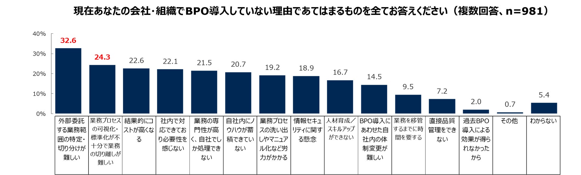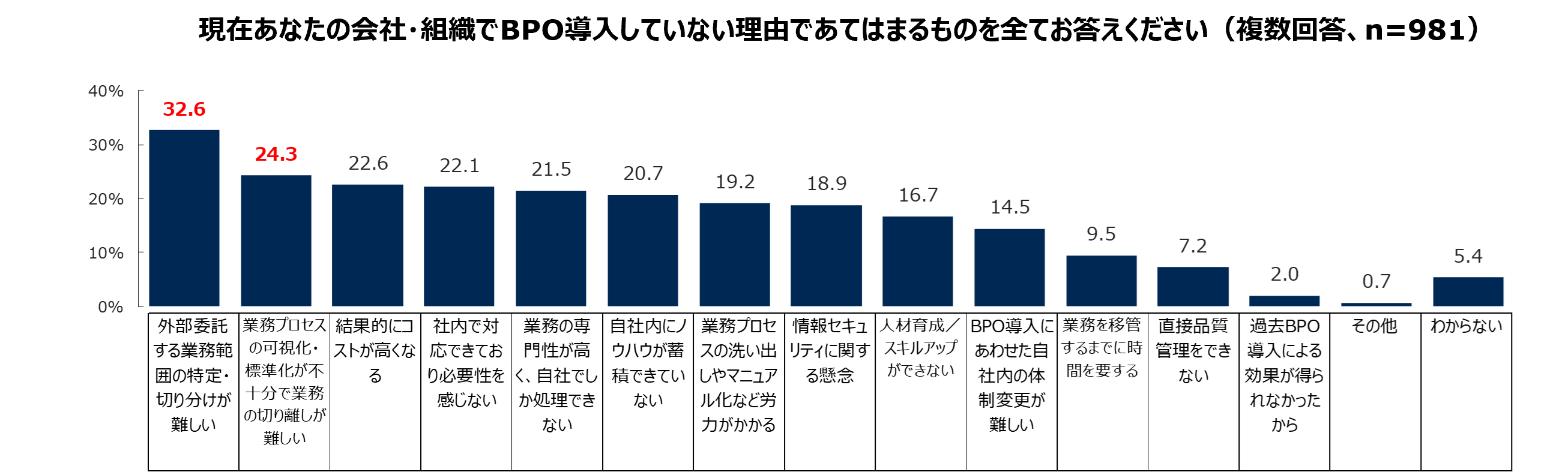 BPOを導入していないと回答した981名を対象に、導入していない理由を聞いたところ、「外部委託する業務範囲の特定・切り分けが難しい」が32.6%で最も多く、次いで「業務プロセスの可視化・標準化が不十分で業務の切り離しが難しい」が24.3%となり、外部委託における業務の切り分けや業務プロセスの標準化などがBPO導入の障壁となっていることが浮き彫りになりました。