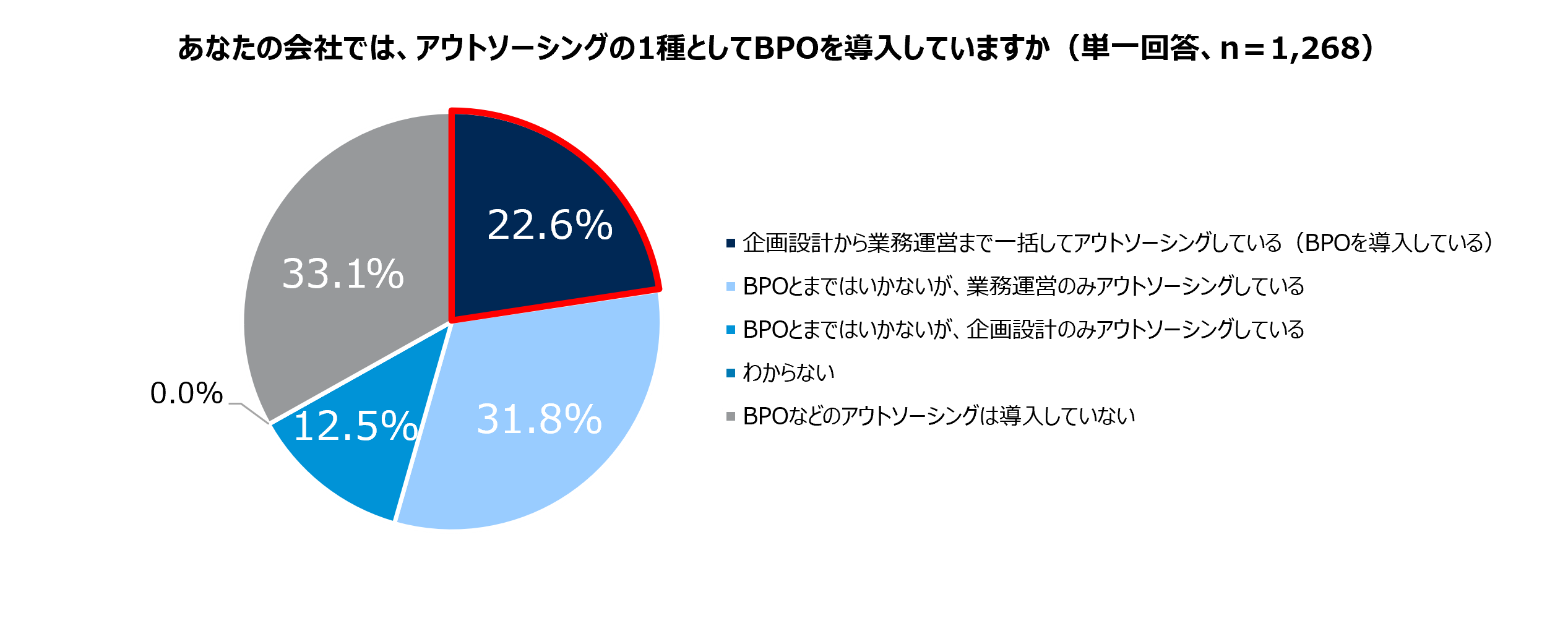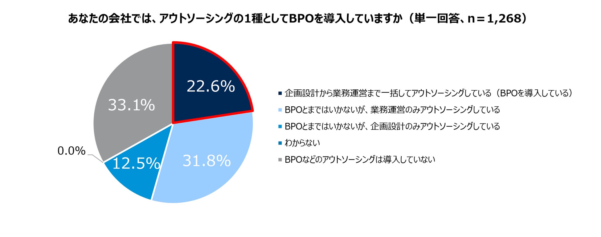 BPO導入の計画・検討・選考に関わる1,268名の経営層または管理職を対象に、BPOの導入状況について聞いたところ、約2割(287名)が「企画設計から業務運営まで一括してアウトソーシングしている(BPOを導入している)」と回答しました。