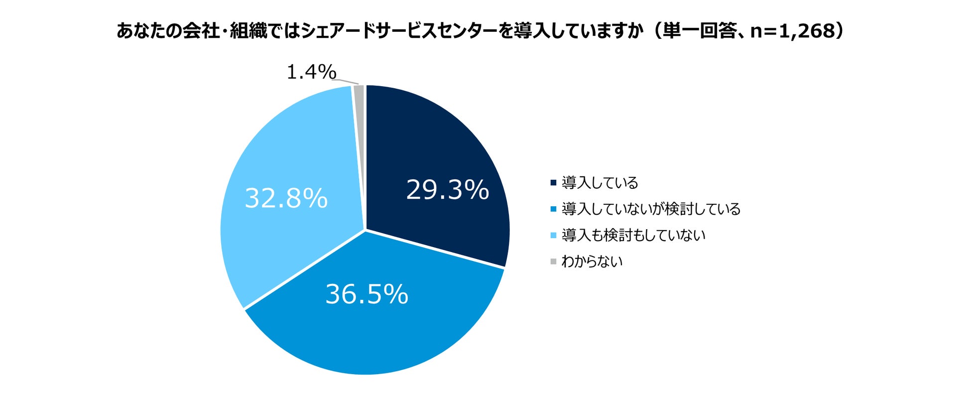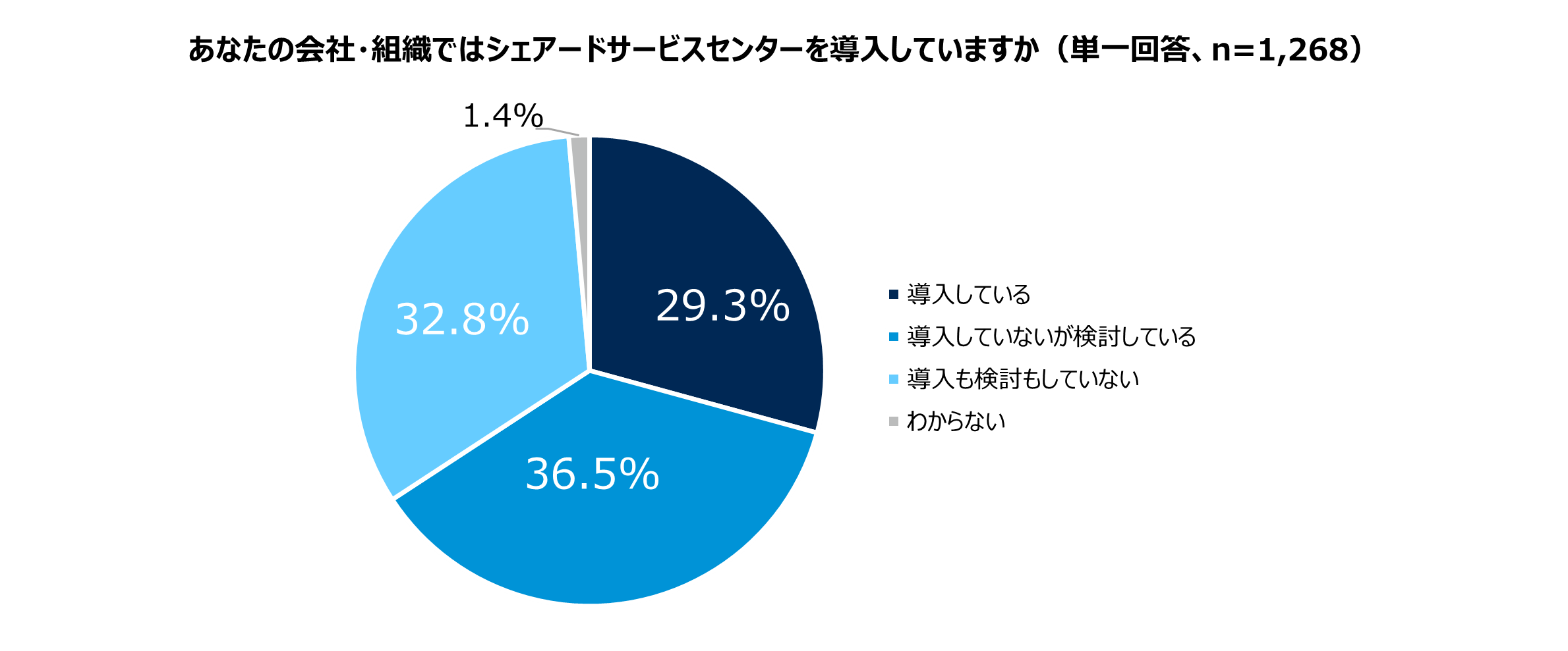 BPO導入の計画・検討・選考に関わる1,268名の経営層または管理職を対象に、シェアードサービスセンター(以下「SSC」)の導入状況について聞いたところ、「導入している」は29.3%(371名)、「導入していないが検討している」は36.5%でした。