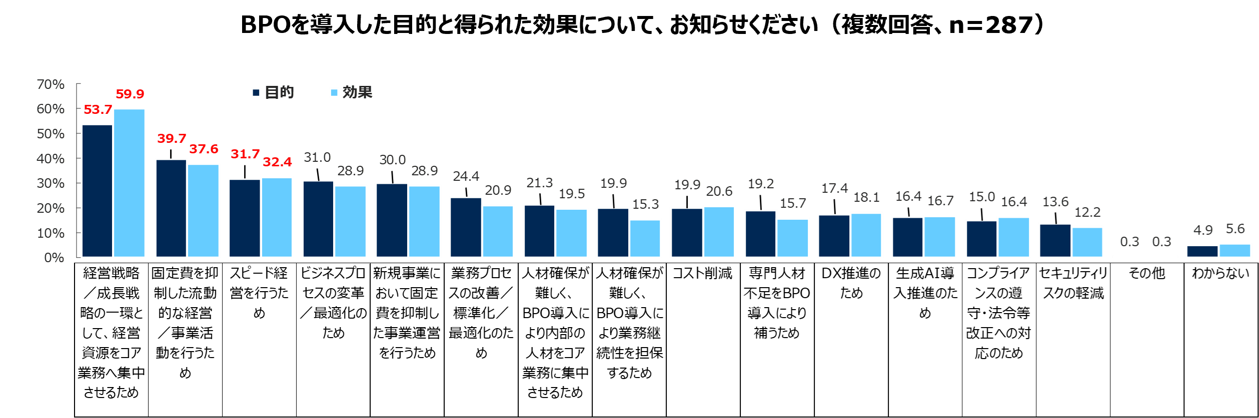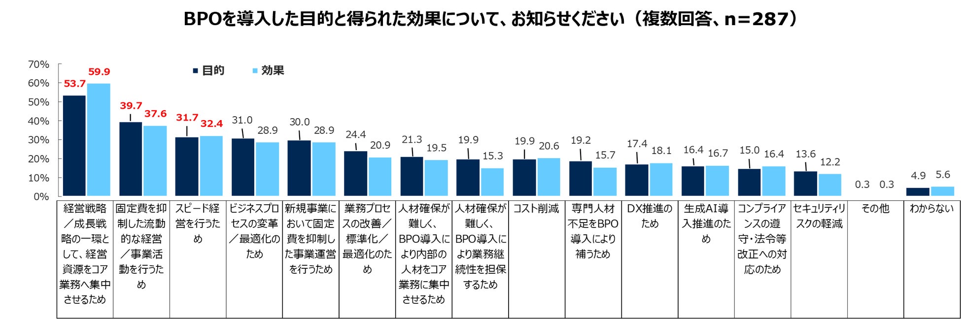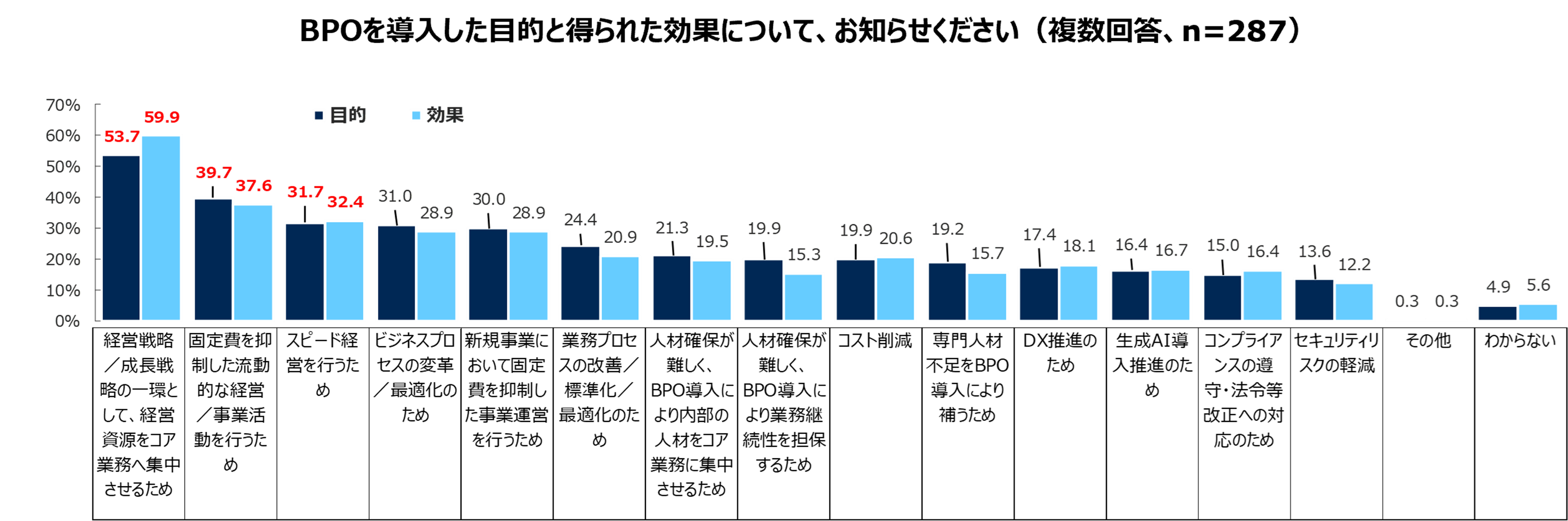 また、現在BPOを導入していると回答した287名を対象に、導入の目的と導入による得られた効果を聞いたところ、上位3項目は一致していました。