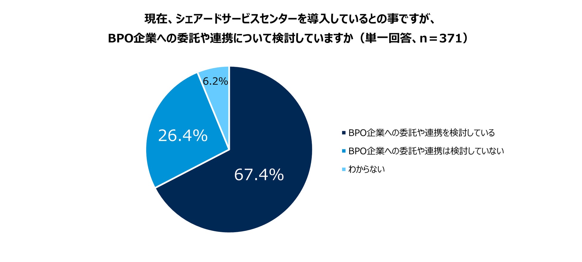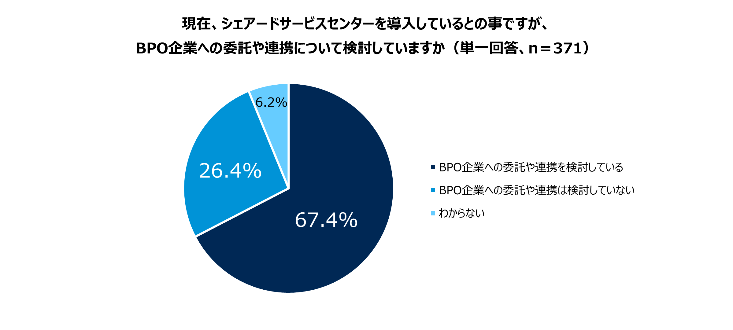 SSCを導入していると回答した371名に対して、BPO企業への委託や連携について検討状況を聞いたところ、約7割が「BPO企業への委託や連携を検討している」と回答しました。