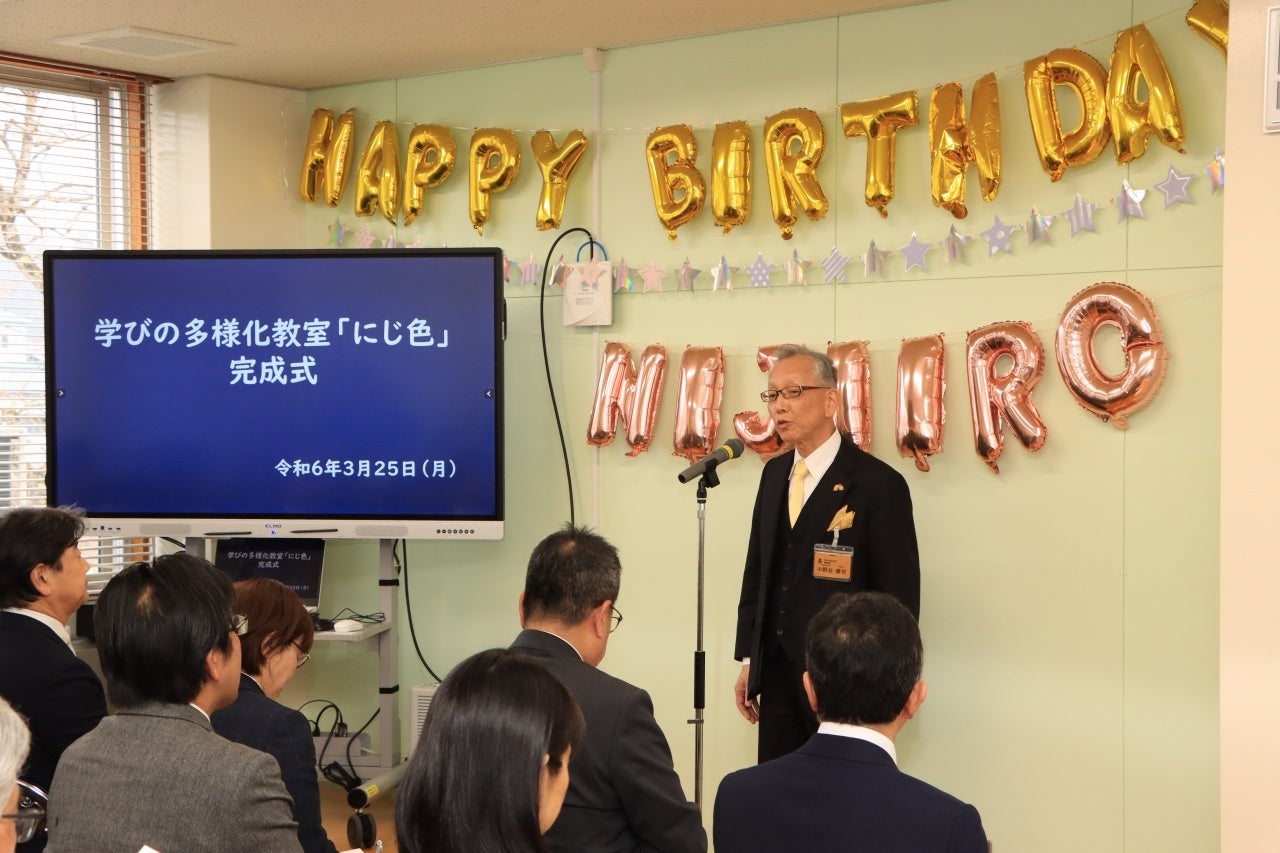 3月25日に行なわれた完成式典では、中野谷康司高山市教育長から「皆さんのご理解とご支援のおかけでようやく完成した。にじ色は、誰かに合わせるのではなく、”あなたが選べる”新しいスタイルの居場所・学びの場所として、次の時代の教育を考える一助となり、子どもたちにとって希望の場になることを願っている。」とのお話がありました。