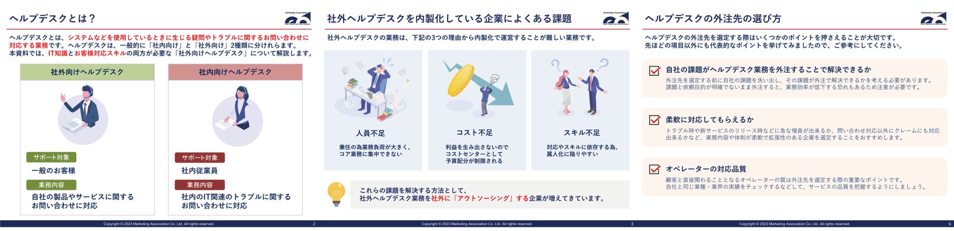 社外ヘルプデスク代行サービスを提供しているマーケティングアソシエーション株式会社(本社:東京都台東区 代表取締役:中園広和、以下当社)は、お役立ち資料「社外ヘルプデスクを外注すべき理由」を無料公開しました。