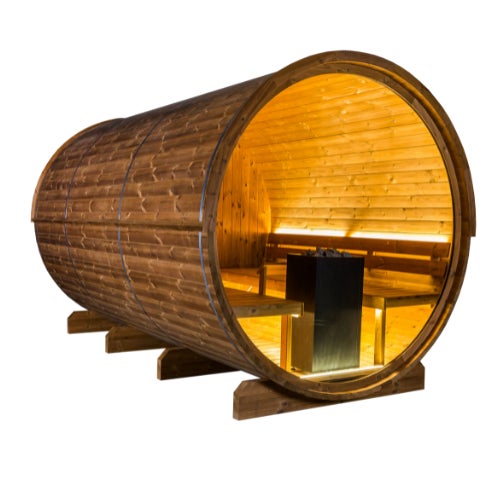 前室付きの大型バレル。ペアガラスの大きな円形窓で景色も熱さも楽しめます