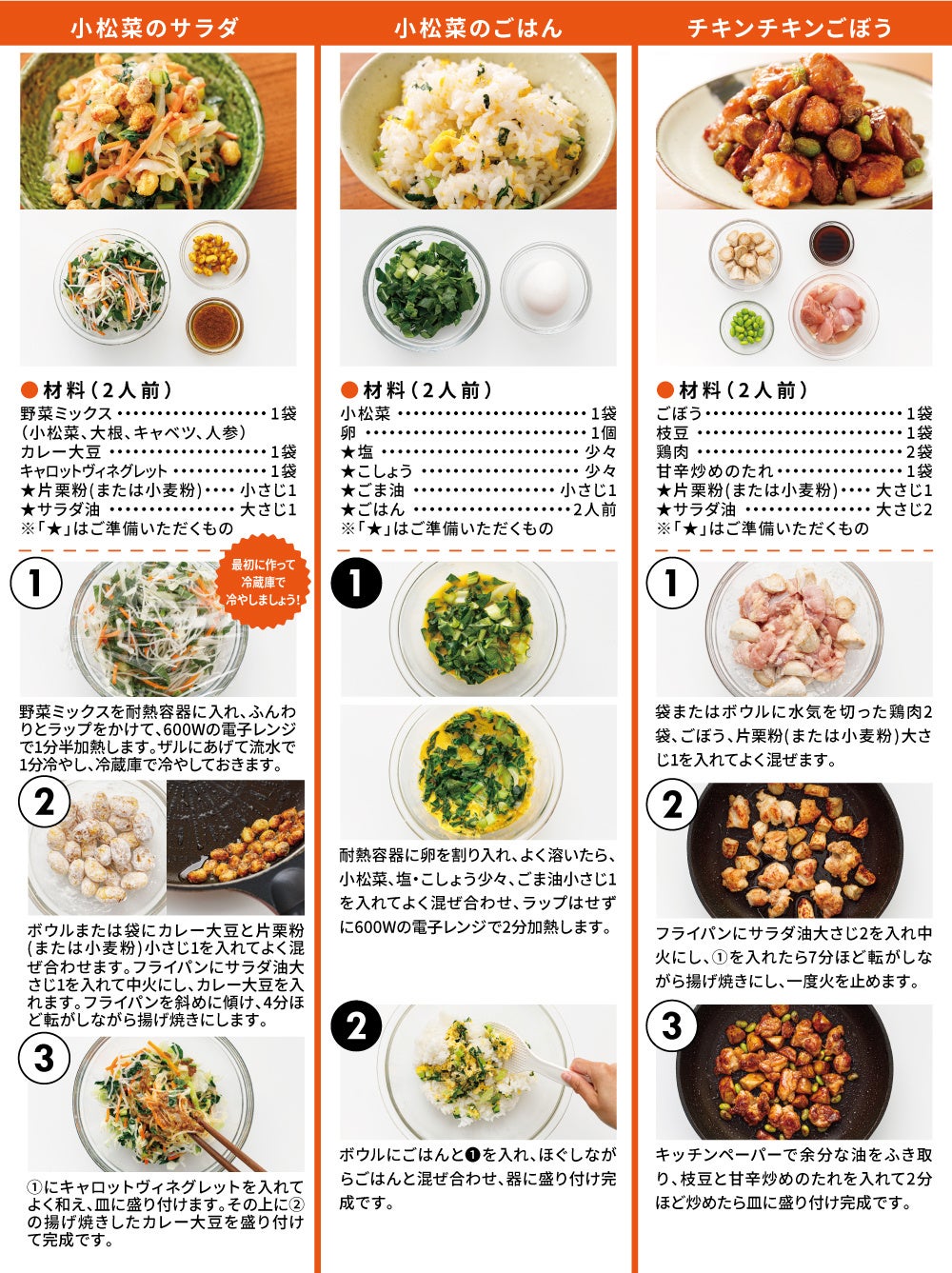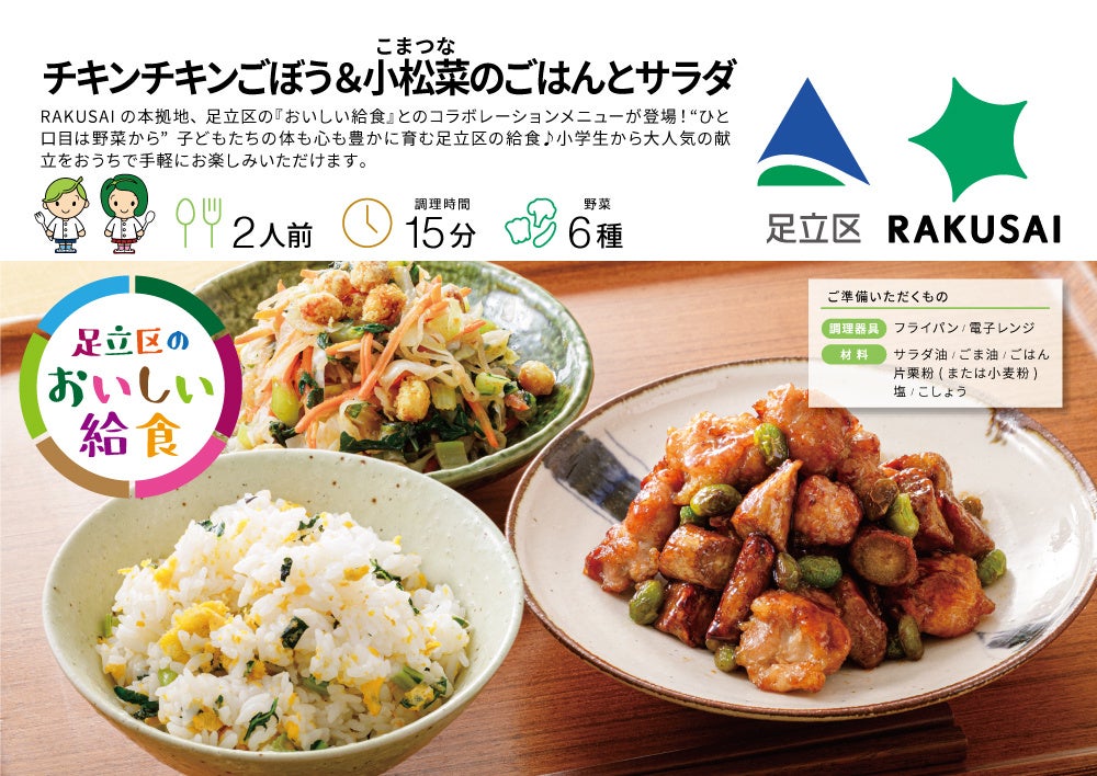 足立区の『おいしい給食』人気メニュー“チキンチキンごぼう”をご自宅で楽しむことができます。彩り鮮やかな”小松菜のごはん”と”サラダ”をセットにし、主菜・副菜・ごはんの3品が15分でつくれるミールキットです。