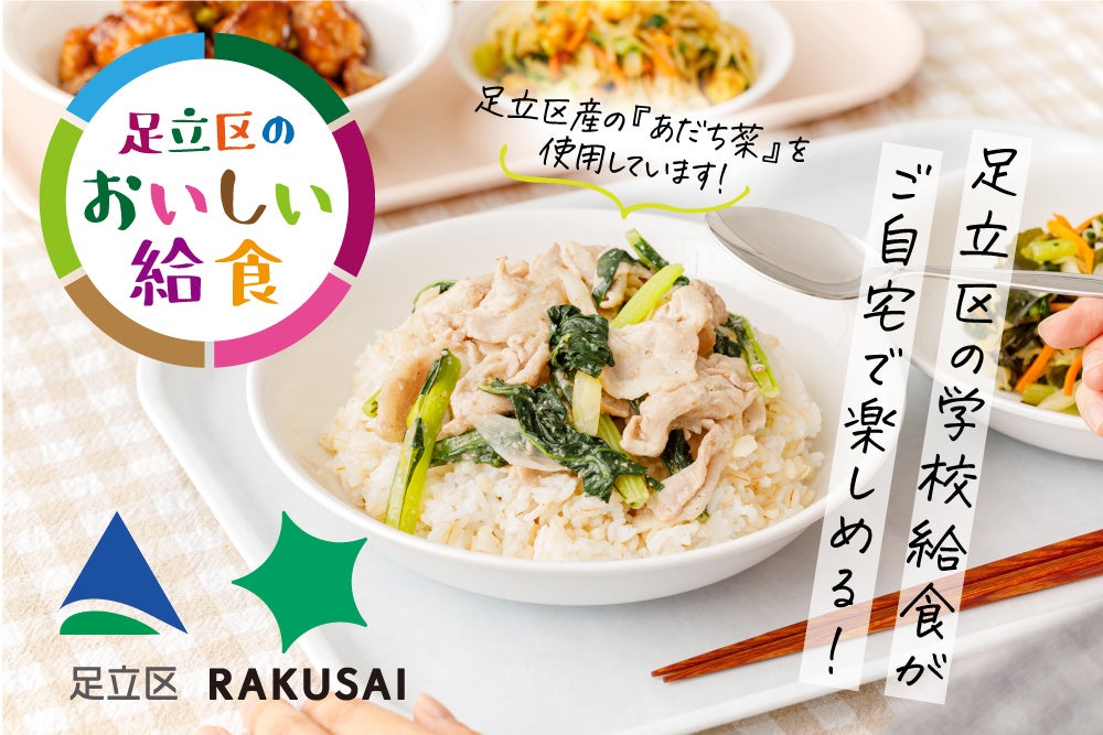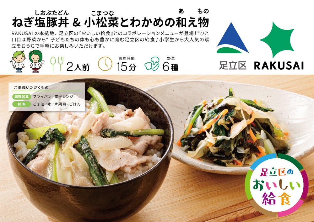 楽彩株式会社(本社:東京都足立区/代表取締役社長:大﨑善保)は、東京都足立区(区長:近藤やよい)と連携し2024年11月22日(金)より足立区×RAKUSAI『おいしい給食』コラボレーション商品“ねぎ塩豚丼&小松菜とわかめの和え物”“ チキンチキンごぼう&小松菜のごはんとサラダ”を販売いたします。今回は本商品を通じて健康増進や食育に繋がる取組みを実施するとともに、足立区の魅力をRAKUSAIミールキットで発信してまいります。