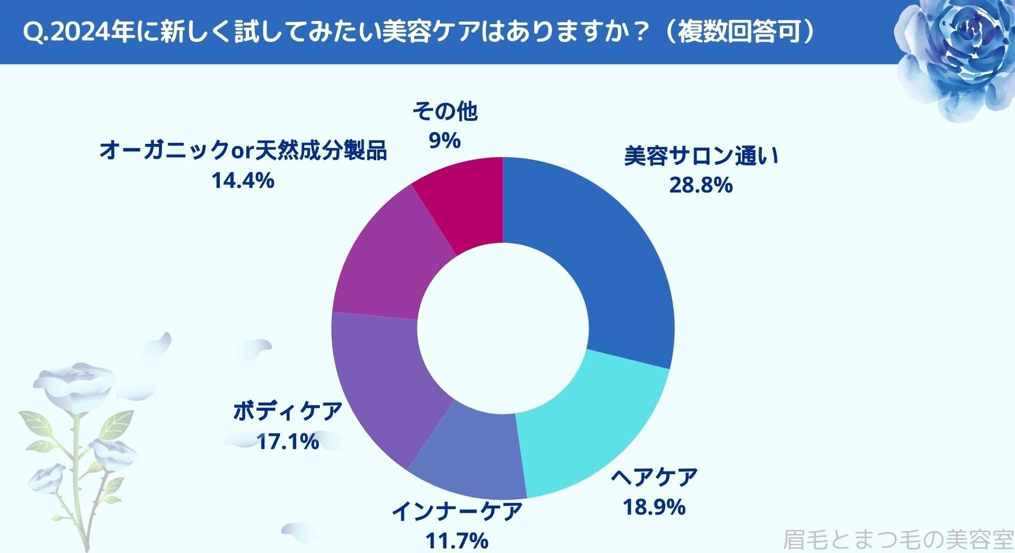 2024年に新しく試してみたい美容ケアがあるかお聞きしたところ「美容サロン通い(28.8%)」、「ヘアケア(18.9%)」、「インナーケア(11.7%)」、「ボディケア(17.1%)」、「オーガニック製品(14.4%)」、「その他(9%)」という結果になりました。