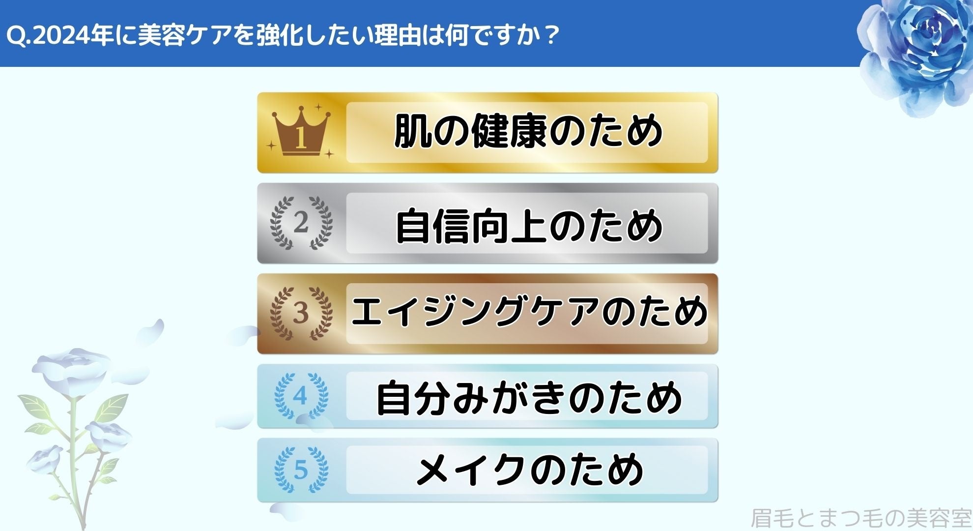 2024年に美容ケアを強化したい理由をお聞きしたところ「1位>肌の健康のため」、「2位>自信向上のため」、「3位>エイジングケアのため」、「4位>自分みがきのため」、「5位>メイクのため」という結果になりました。