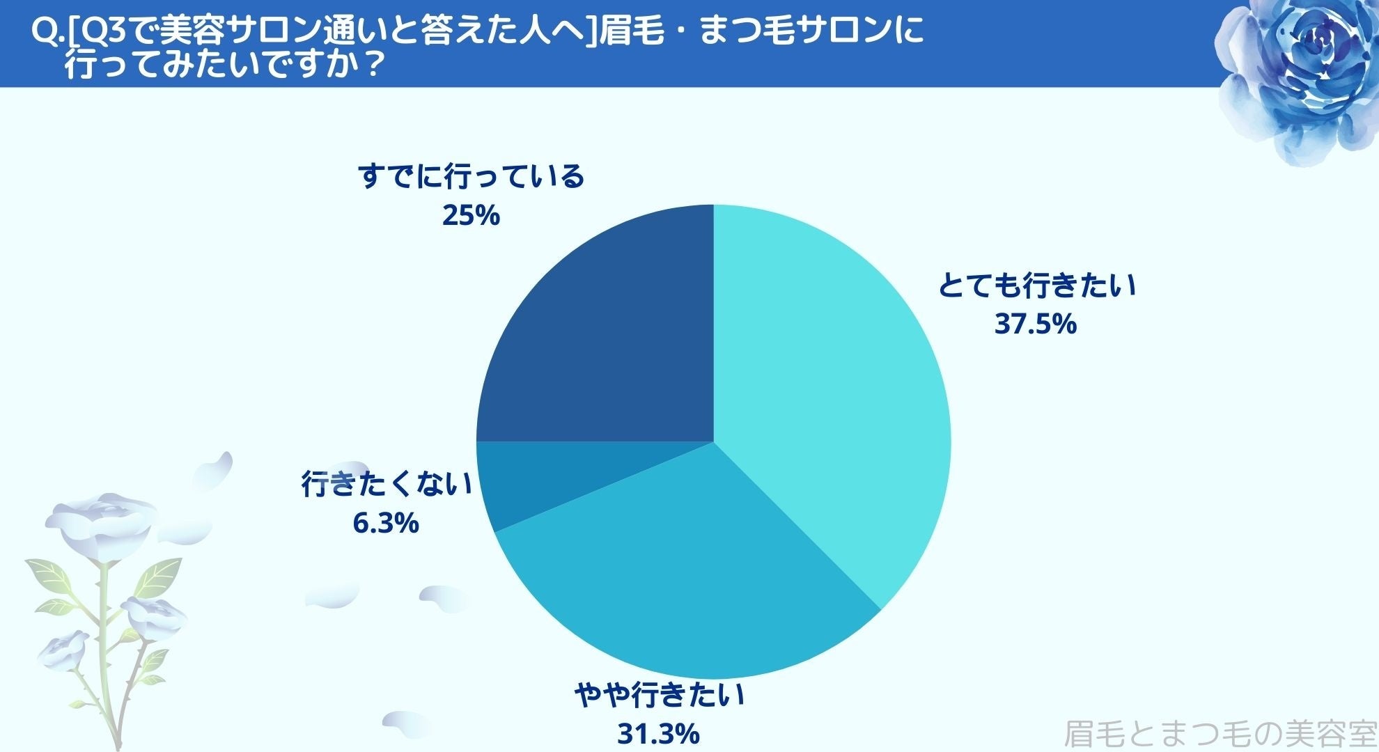 眉毛・まつ毛サロンに行ってみたいかお聞きしたところ「とても行きたい(37.5%)」、「やや行きたい(31.3%)」、「行きたくない(6.3%)」、「すでに行っている(25%)」という結果になりました。